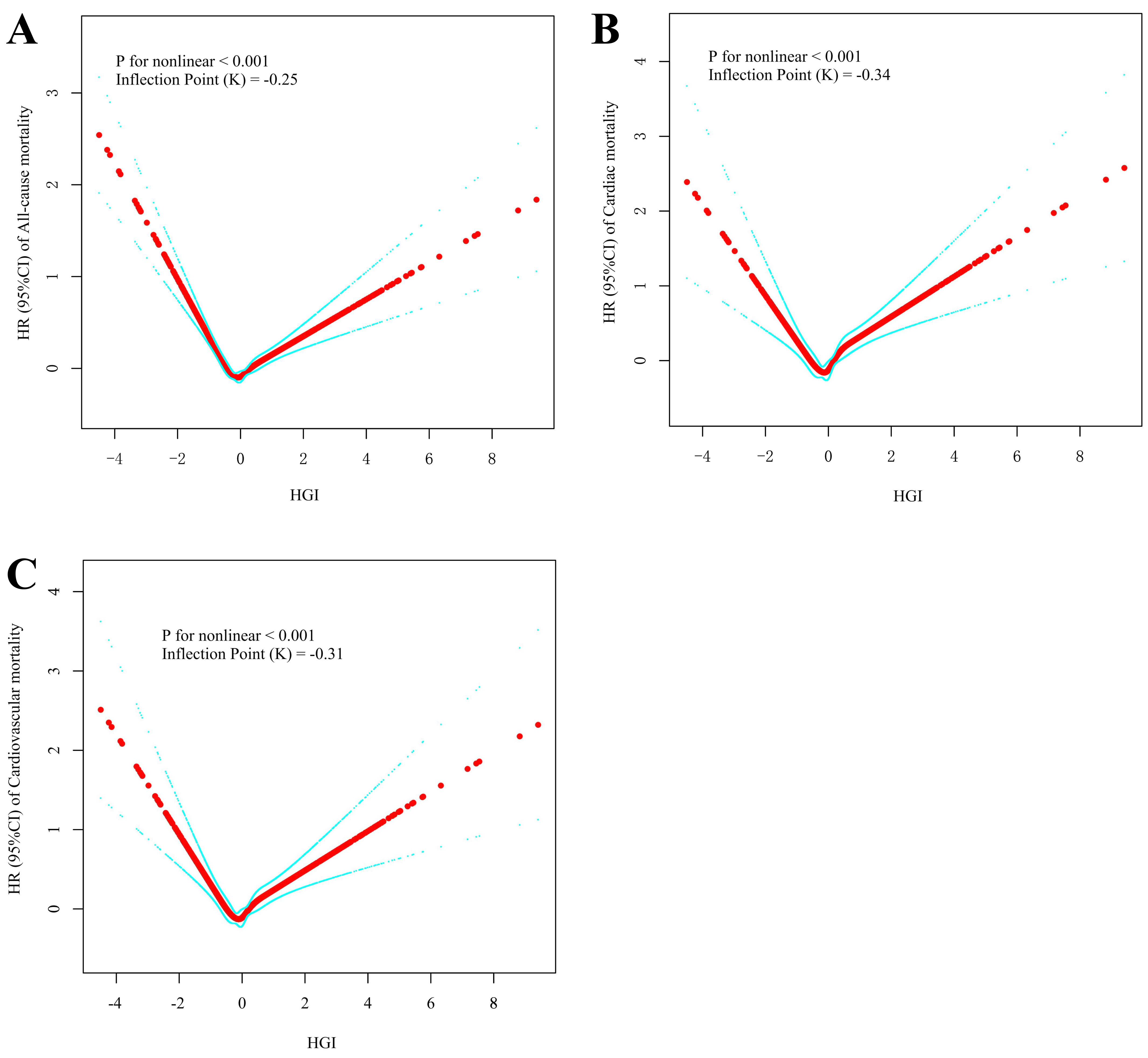 Fig. 4. Restricted cubic spline curve analysis for the HGI hazard ratio. (A) All-cause mortality. (B) Cardiac mortality. (C) Cardiovascular mortality.