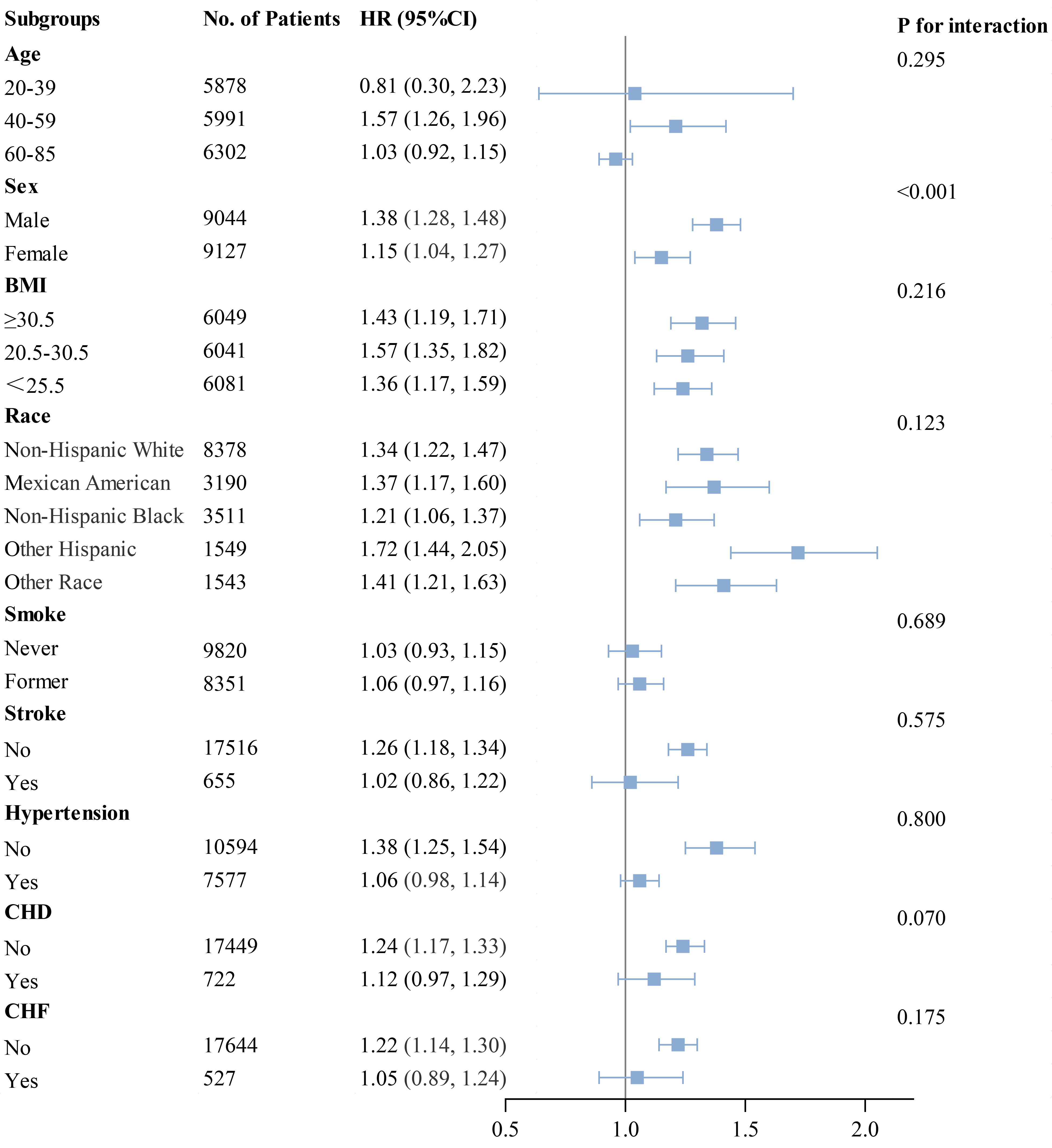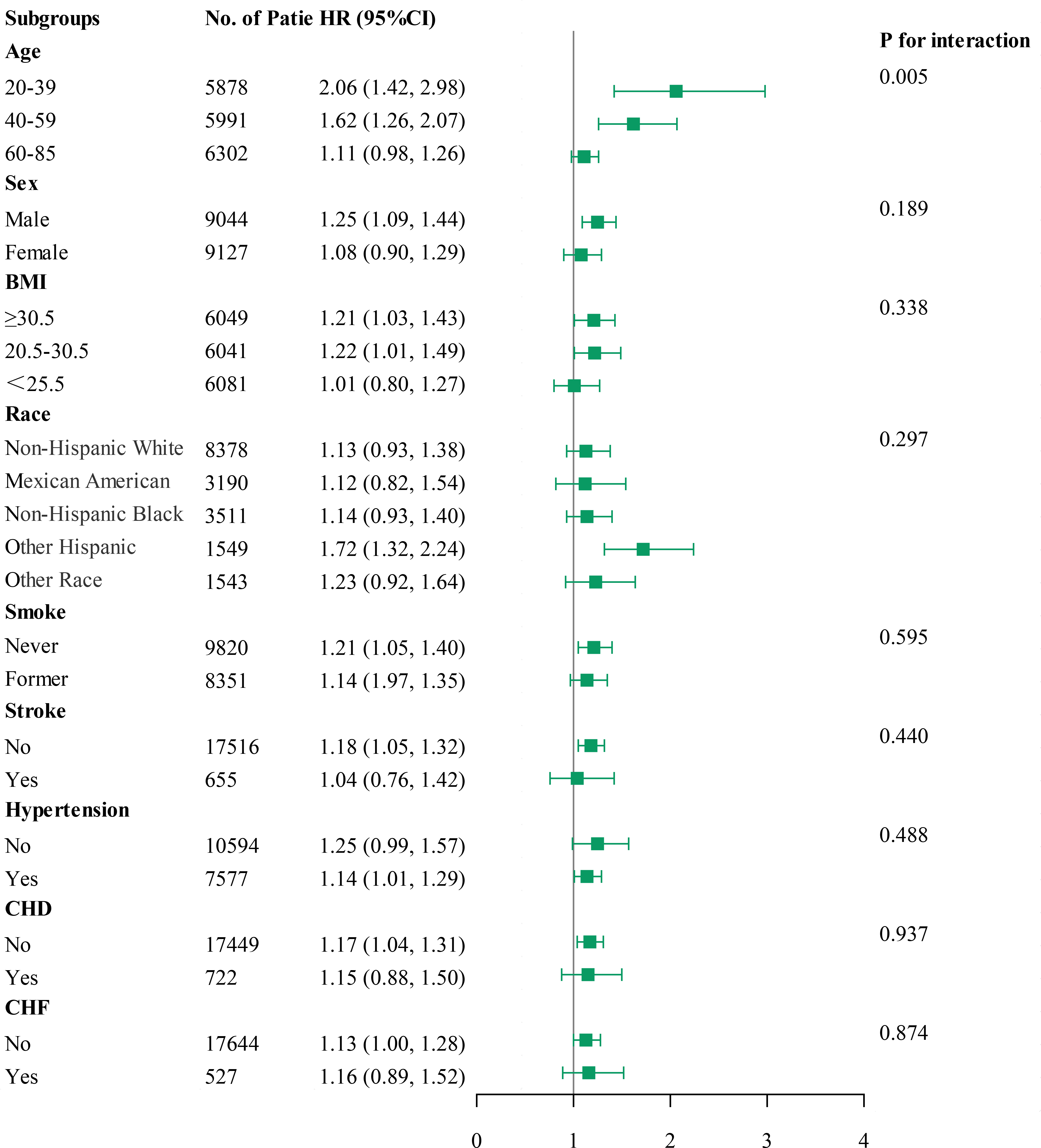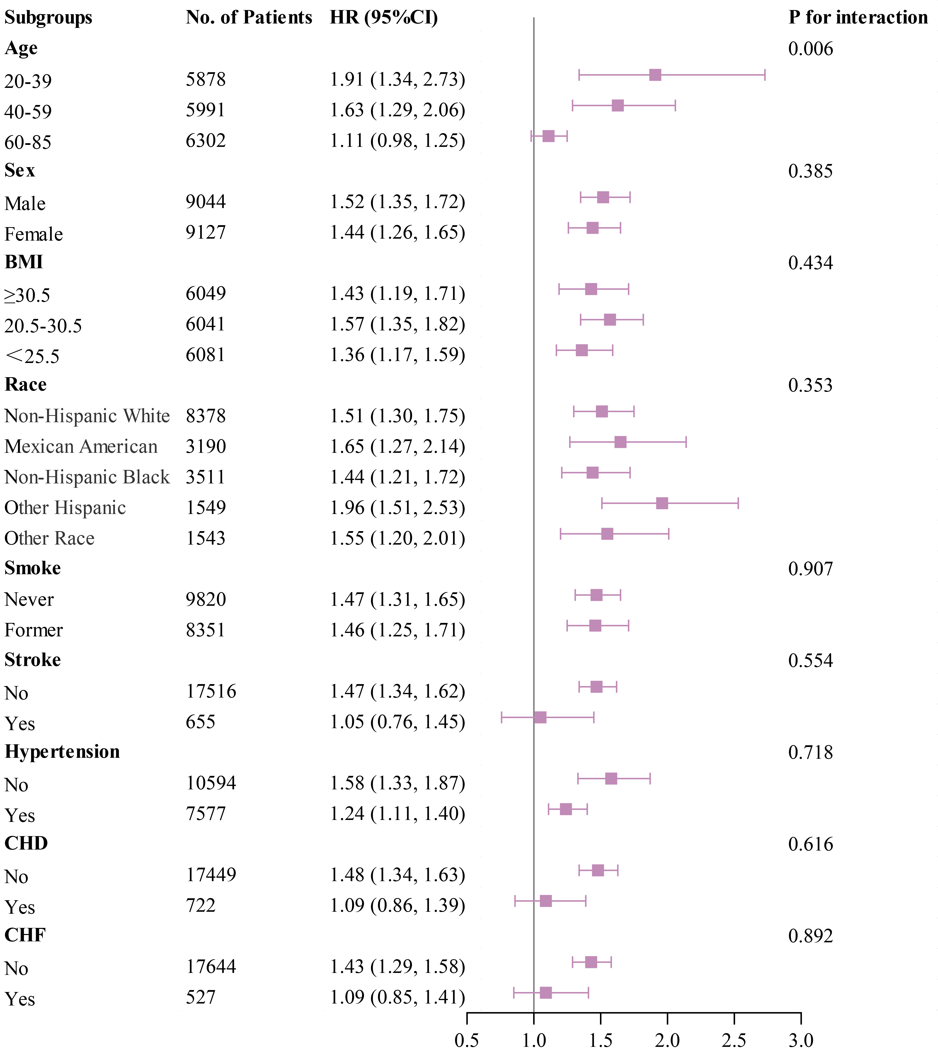 The impact of HGI on outcome variables in the subgroup analysis conducted in this study remained consistent across predefined subgroups, except for differences related to sex in all-cause mortality and age in cardiac and cardiovascular mortalities. The observed sex disparity in all-cause mortality may reflect inherent differences in life expectancy between genders. Regarding cardiac mortality and cardiometabolic mortality, individuals aged 20–39 exhibited the highest mortality risk. The better self-care capabilities and perceived notions of being healthy may contribute to younger adults often underestimating their susceptibility to metabolic and CVDs such as hypertension, DM, and CHD. Clinical observations indicate that early-onset cardiovascular and metabolic diseases among younger adults can lead to poorer prognoses compared to older adults. Additionally, the forest plot suggests that patients without stroke, hypertension, coronary heart disease, or CHF but with high HGI values may have a higher mortality rate. This phenomenon is surprising, and to some extent, it is possible that the HGI is more closely associated with mortality in this group of patients. However, due to the retrospective cohort design of this study, study bias may exist. Therefore, further prospective studies may be needed in the future to explore this aspect.