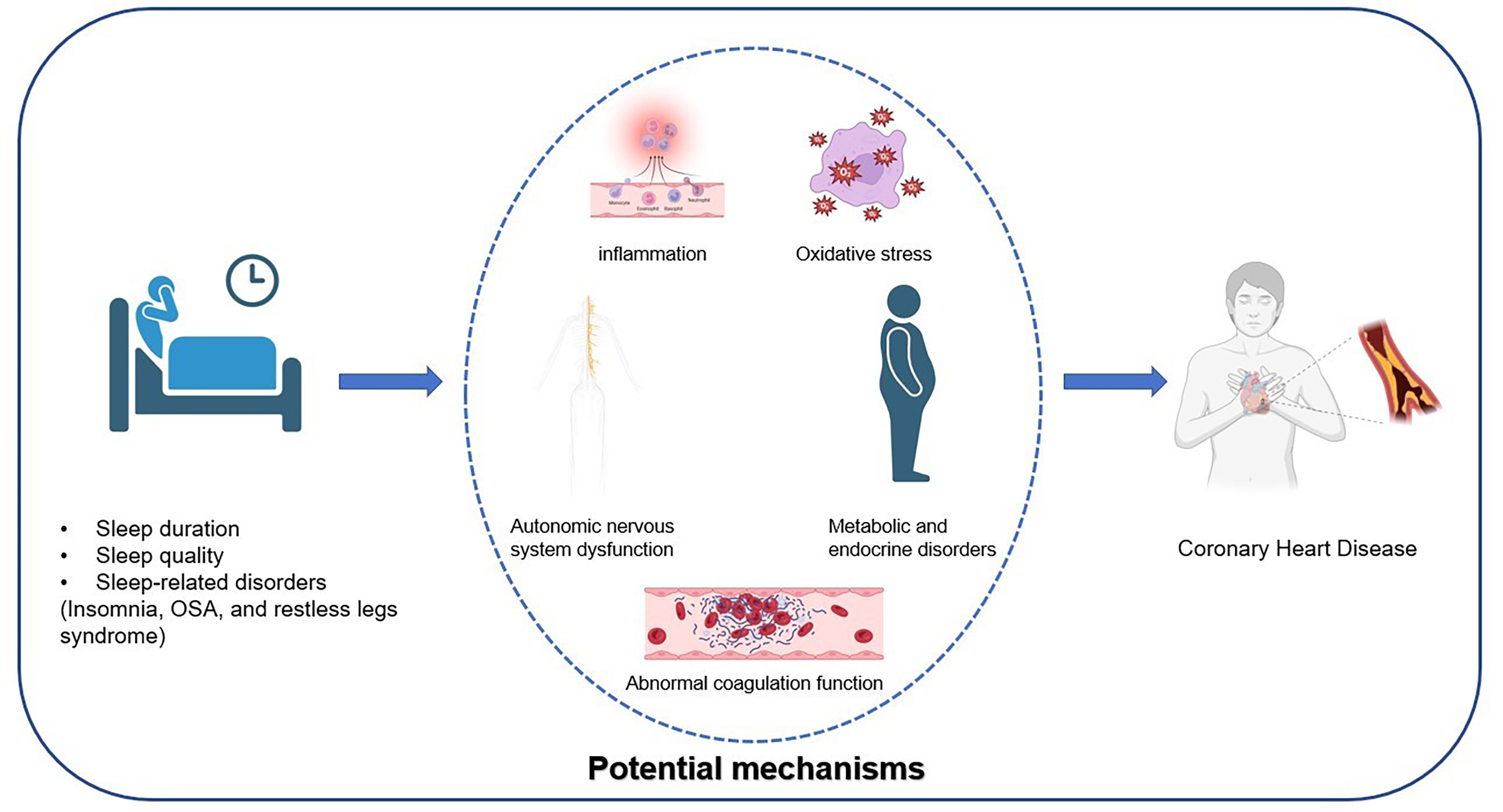 The impact of poor sleep on heart health is widely recognized in the scientific community; however, the specific mechanisms by which poor sleep leads to CHD remain unclear. A summary of previous studies suggests that poor sleep may promote the development of atherosclerosis and CHD through mechanisms such as inflammation, oxidative stress, autonomic nervous system dysfunction, metabolic and endocrine disturbances, and coagulation abnormalities.