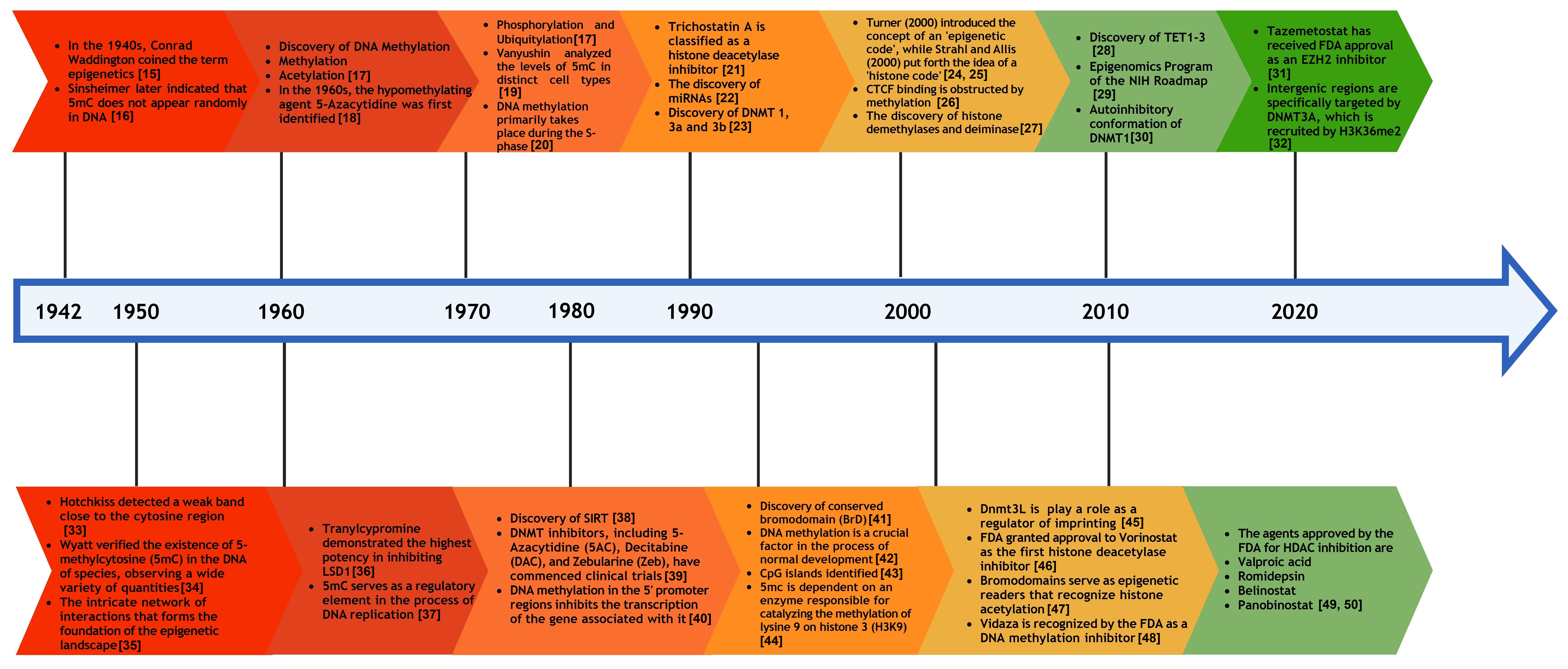 The process of histone acetylation is linked to the alteration in chromatin structure in transcriptionally active regions. This modification involves the addition of acetyl groups (COCH3) to the lysine residues located in the N-terminal tails of histones, a reaction catalyzed by histone acetyltransferases (HATs). The impact of histone modification functions is determined not solely by the sites of these modifications, including the specific amino acid residues and genomic regions, but also by the type and extent of modifications occurring on the histones. It has been suggested that epigenetic changes may help clarify the missing elements of inheritance in the sequence variations of complex diseases, including atherosclerosis, metabolic syndrome, hypertension, and diabetes, which genetic studies have yet to explain fully [13]. Thus, epigenetic alterations play a central role in the expression and, consequently, in the pathogenesis and progression of HDs by influencing the expression of genes involved in cell survival and death. Recent developments have helped open new avenues for targeting these pathways in the design of novel therapeutic strategies [14]. Fig. 1 (Ref. [15, 16, 17, 18, 19, 20, 21, 22, 23, 24, 25, 26, 27, 28, 29, 30, 31, 32, 33, 34, 35, 36, 37, 38, 39, 40, 41, 42, 43, 44, 45, 46, 47, 48, 49, 50]) presents a historical timeline of the epigenetic processes and drug development to provide a more thorough understanding of the historical discoveries and research efforts in the field of epigenetics, along with the advancement of epigenetic drug therapies.