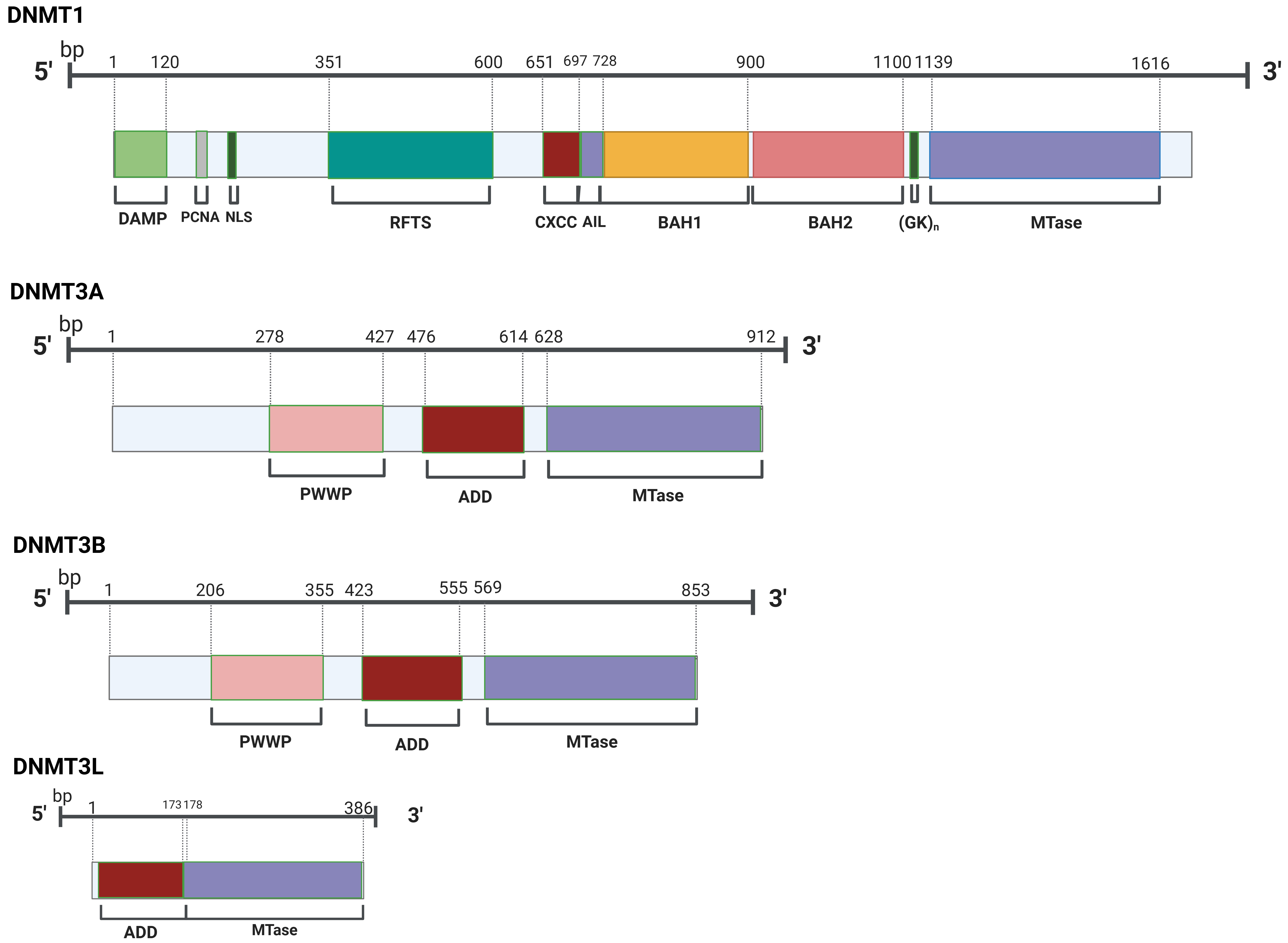 Members of the DNMT family possess a common catalytic domain in their structural composition. DNMT, DNA methyltransferase; DAMP, DNMT1-Associated Maintenance Protein; PCNA, Proliferating Cell Nuclear Antigen; NLS, Nuclear Localization Signal; RFTS, Replication Foci Targeting Sequence; CXXC, Cysteine-X-X-Cysteine; AIL, Autoinhibitory Linker; BAH, Bromo-Adjacent Homology; (GK)n, Glycine Lysine Repeats; PWWP, Pro-Trp-Trp-Pro; ADD, ATRX-DNMT3-DNMT3L; MTase, Methyltransferase.