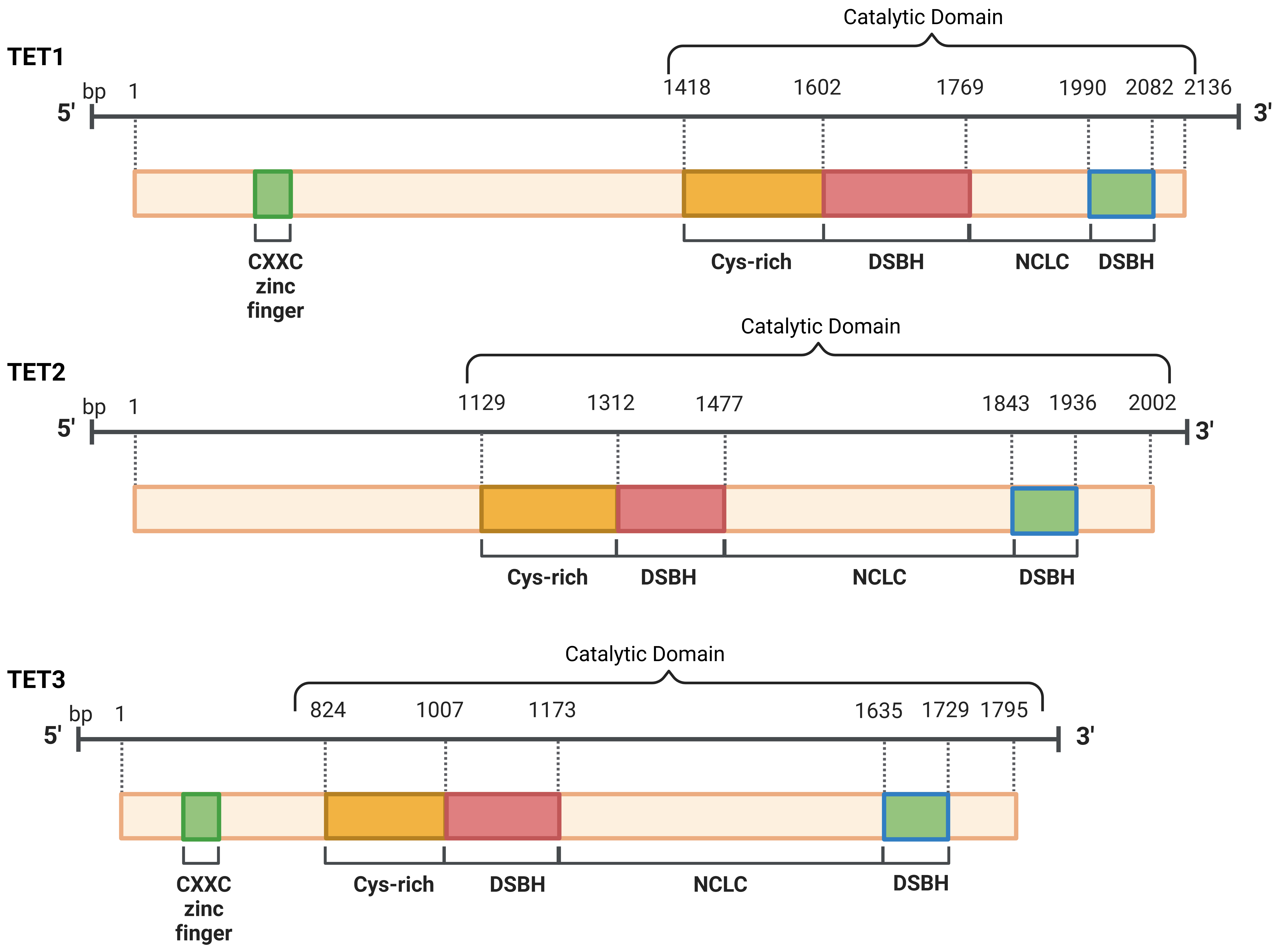 Ten-eleven translocation 1 (TET1) facilitates the conversion of 5-mC into 5-hmC, which was initially identified in 2003. Subsequently, two other TET family members, TET2 and TET3, were characterized shortly after this initial study. Methyl groups that need to be removed during active demethylation are labeled with oxygen atoms. TET enzymes oxidize methylcytosines and mediate DNA demethylation. The TET protein family consists of three members: TET1, TET2, and TET3 [51].