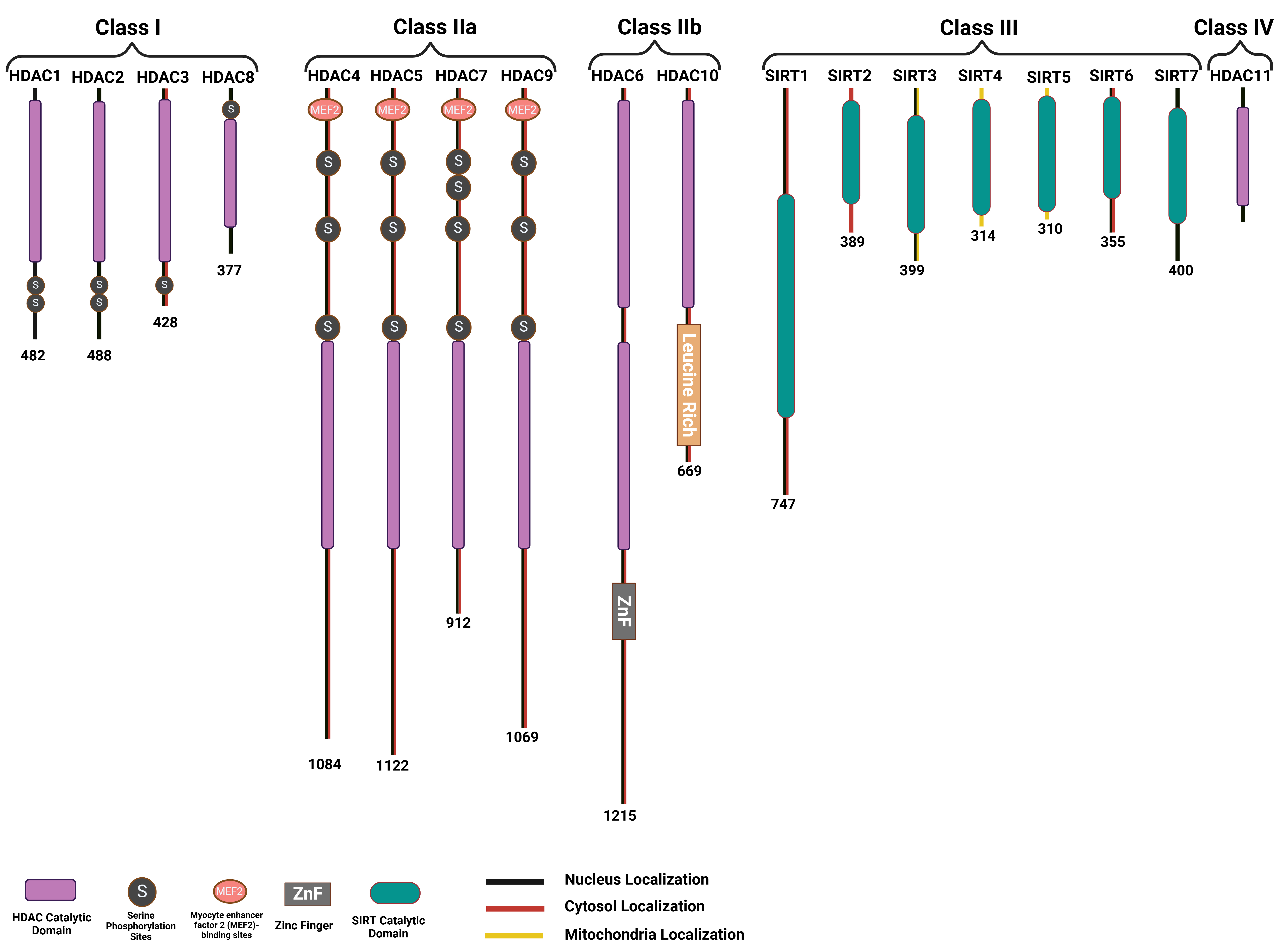 Classifications of the histone deacetylase family and domains that characterize the different members of each HDAC subfamily. HDAC, Histone deacetylase; SIRT, Sirtuin.