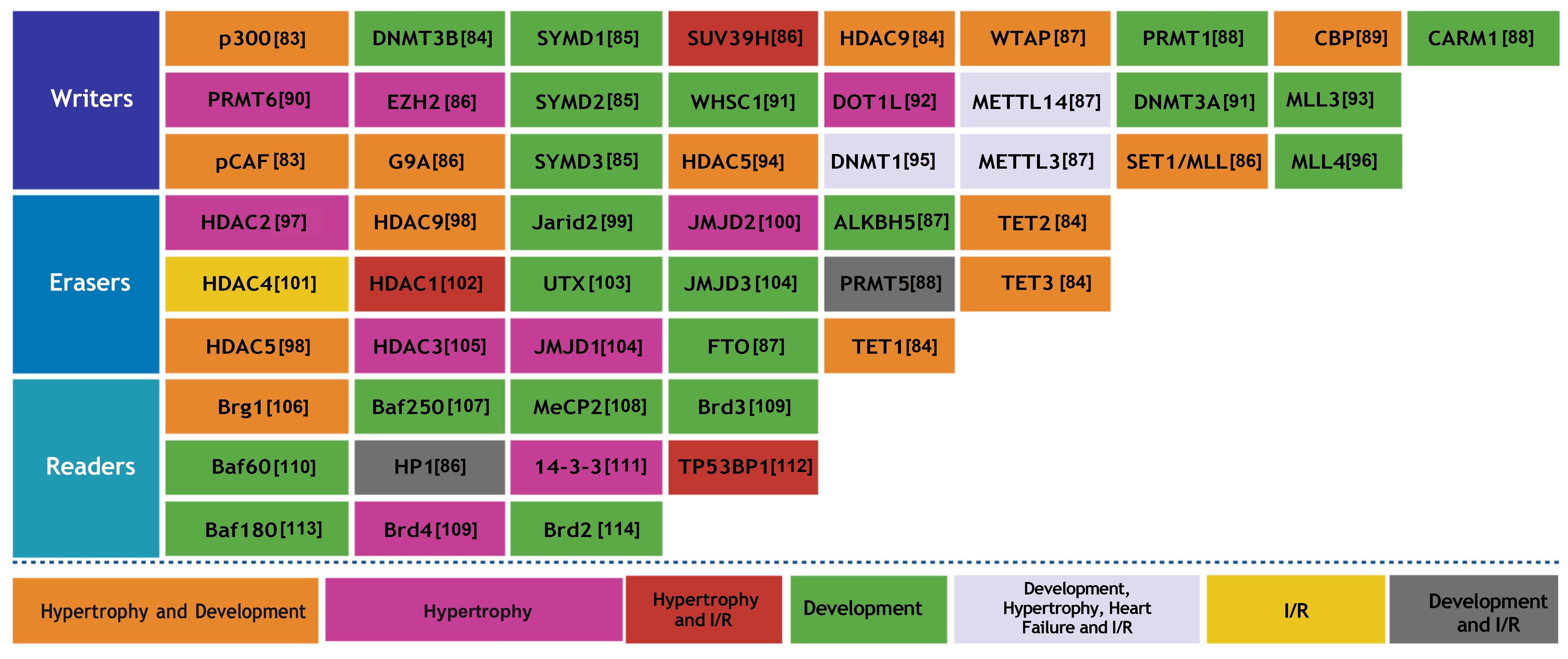 A variety of epigenetic writers, including histone acetyltransferases, methyltransferases, and RNA methylation regulators, are integral to cardiac development, homeostasis, and disease. When these enzymes are dysregulated, they can contribute to congenital heart defects, hypertrophy, ischemia/reperfusion injury, and HF by altering gene expression through chromatin and RNA modifications (Fig. 5) [83, 84, 85, 86, 87, 88, 89, 90, 91, 92, 93, 94, 95, 96, 97, 98, 99, 100, 101, 102, 103, 104, 105, 106, 107, 108, 109, 110, 111, 112, 113, 114].