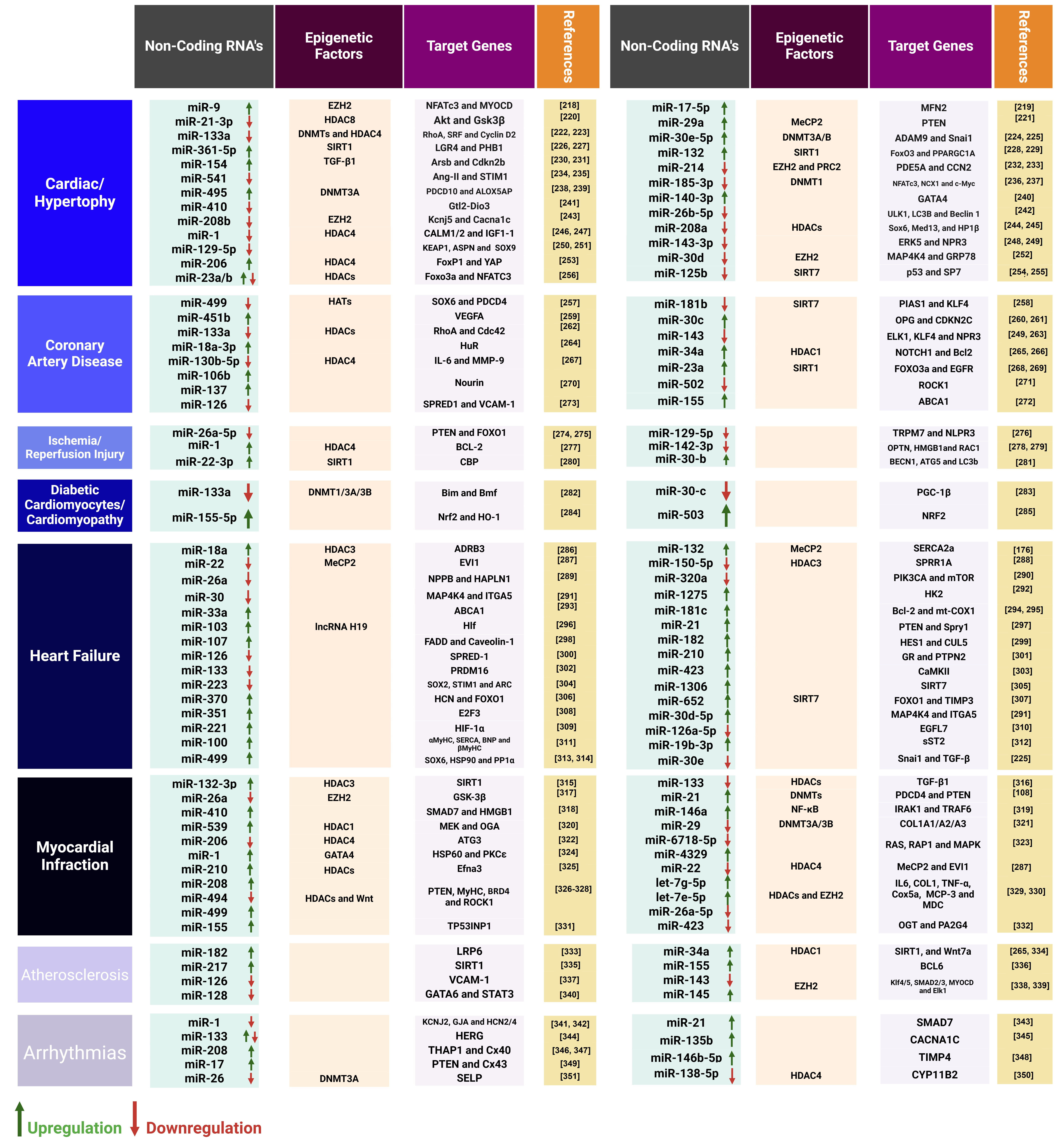 The transcription of microRNA from miRNA loci and their corresponding host genes indicates the participation of transcription factors, epigenetic regulators, and enhancers, which are key components of the transcriptional machinery [217]. Variations in miRNA expression are typically presented (Fig. 6, Ref. [108, 176, 218, 219, 220, 221, 222, 223, 224, 225, 226, 227, 228, 229, 230, 231, 232, 233, 234, 235, 236, 237, 238, 239, 240, 241, 242, 243, 244, 245, 246, 247, 248, 249, 250, 251, 252, 253, 254, 255, 256, 257, 258, 259, 260, 261, 262, 263, 264, 265, 266, 267, 268, 269, 270, 271, 272, 273, 274, 275, 276, 277, 278, 279, 280, 281, 282, 283, 284, 285, 286, 287, 288, 289, 290, 291, 292, 293, 294, 295, 296, 297, 298, 299, 300, 301, 302, 303, 304, 305, 306, 307, 308, 309, 310, 311, 312, 313, 314, 315, 316, 317, 318, 319, 320, 321, 322, 323, 324, 325, 326, 327, 328, 329, 330, 331, 332, 333, 334, 335, 336, 337, 338, 339, 340, 341, 342, 343, 344, 345, 346, 347, 348, 349, 350, 351]). This figure provides a comprehensive overview of miRNA-mediated regulation in heart diseases, aiding in the identification of potential therapeutic targets and molecular pathways involved in heart-related disorders [108, 176, 218, 219, 220, 221, 222, 223, 224, 225, 226, 227, 228, 229, 230, 231, 232, 233, 234, 235, 236, 237, 238, 239, 240, 241, 242, 243, 244, 245, 246, 247, 248, 249, 250, 251, 252, 253, 254, 255, 256, 257, 258, 259, 260, 261, 262, 263, 264, 265, 266, 267, 268, 269, 270, 271, 272, 273, 274, 275, 276, 277, 278, 279, 280, 281, 282, 283, 284, 285, 286, 287, 288, 289, 290, 291, 292, 293, 294, 295, 296, 297, 298, 299, 300, 301, 302, 303, 304, 305, 306, 307, 308, 309, 310, 311, 312, 313, 314, 315, 316, 317, 318, 319, 320, 321, 322, 323, 324, 325, 326, 327, 328, 329, 330, 331, 332, 333, 334, 335, 336, 337, 338, 339, 340, 341, 342, 343, 344, 345, 346, 347, 348, 349, 350, 351].