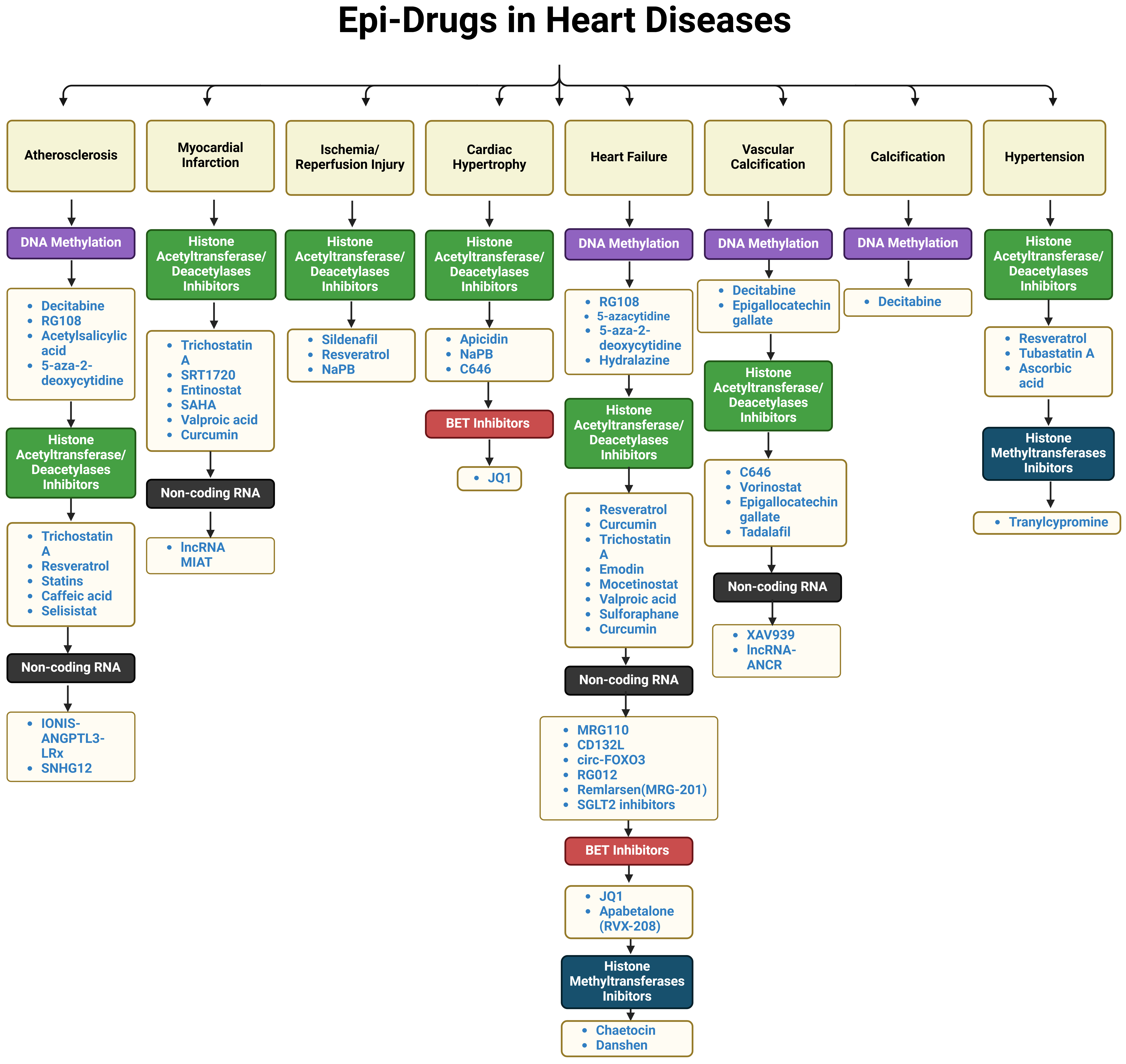 Various drug candidates that target epigenetic molecules have been discovered for cancer treatment and other diseases (Fig. 7). Additionally, some of these candidates have been used in research on CH and HF, involving both cellular and animal models.