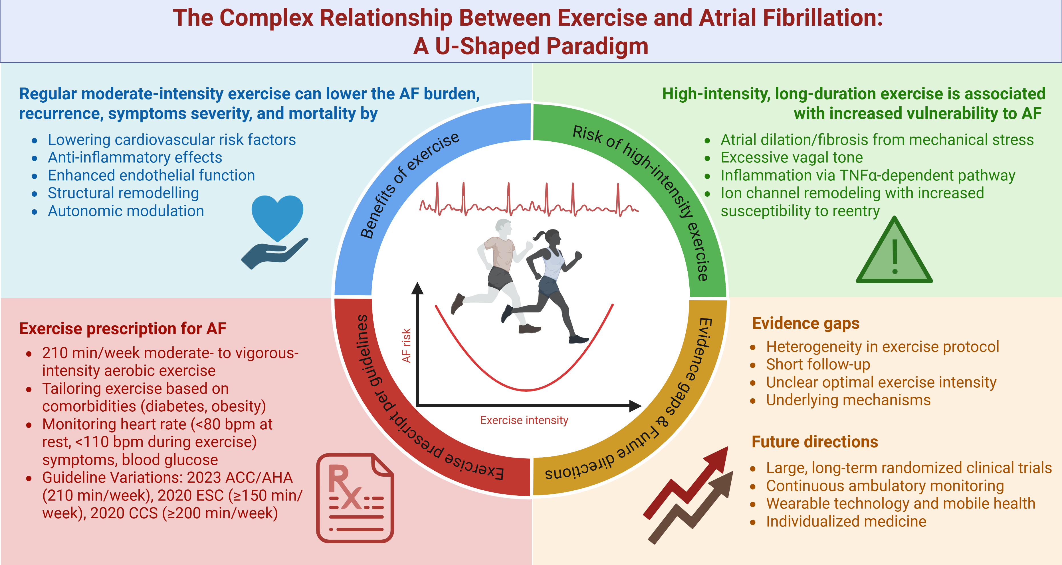 Atrial fibrillation (AF) is the most common, sustained cardiac arrhythmia, contributing to a significant and growing global health burden [1]. In 2020, the estimated global prevalence of AF was approximately 50 million and is projected to increase further. This surging burden is driven by multiple factors, including the aging population, rising obesity rates, improved detection methods, and enhanced survival among individuals with AF and other cardiovascular diseases [2, 3]. AF is associated with increased morbidity and mortality, increasing the risk of stroke by 2.4-fold, heart failure by 5-fold, and overall mortality by 1.5- to 2-fold [1]. Prior literature has shown that physical exercise improves clinical outcomes in several cardiovascular diseases by reducing mortality and hospitalizations while enhancing cardiac function and quality of life across various exercise types and patient populations [4, 5, 6]. However, the relationship between exercise and AF is complex. It has a dose-dependent effect, with both beneficial and potentially adverse effects [7]. Evidence suggests a U-shaped relationship between exercise intensity and AF risk, with moderate exercise being protective and high-intensity endurance exercise potentially increasing the risk, particularly in athletes [8]. This review aimed to discuss the current understanding of the impact of different exercise intensities and modalities on AF and identify evidence gaps and future research directions.