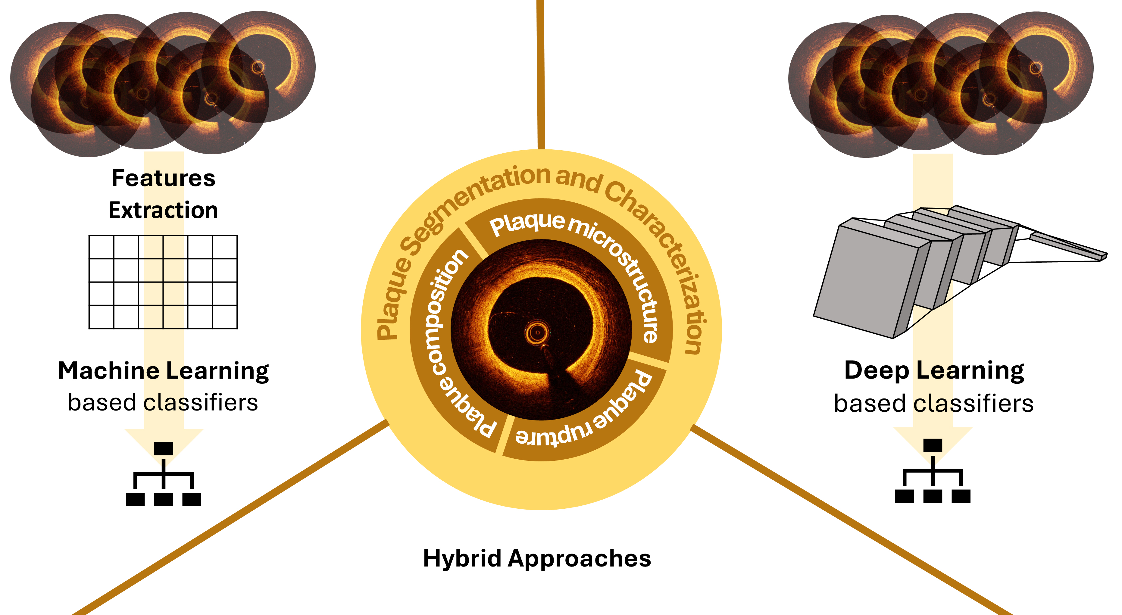 As described in Sections 3.1 and 3.2, ML-based and DL-based approaches are increasingly used in plaque composition characterization in IVOCT images, leveraging their ability to automatically discover patterns and characteristics from large datasets. These methods often rely on conventional ML classifiers, such as support vector machines and random forests, or fully on DL models, such as CNNs or transfer learning approaches. While effective, these stand-alone techniques may struggle to capture the complexities of plaque heterogeneity, especially in cases where limited datasets are available for model training and validation, or where complex anatomical structures are involved.