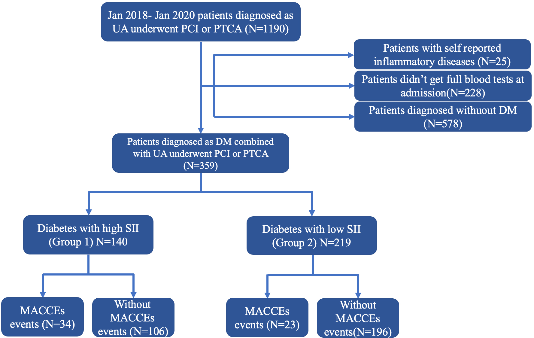 Fig. 1. Flowchart. UA, unstable angina; PCI, percutaneous coronary intervention; PTCA, percutaneous transluminal coronary angioplasty; DM, diabetes mellitus; SII, systemic immune-inflammation index; MACCEs, major adverse cardiac and cerebrovascular events.