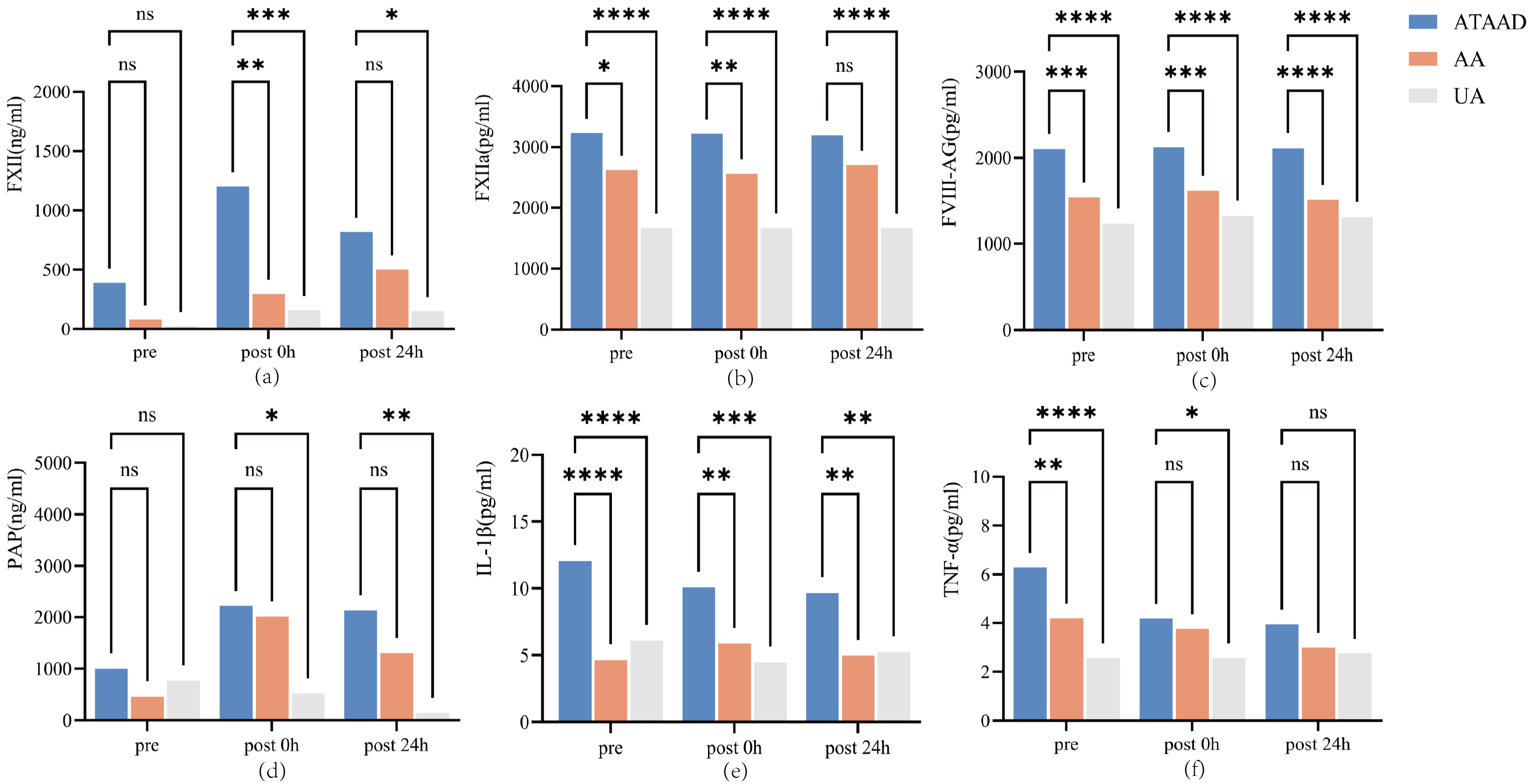 All adult subjects were over 18 years of age, had been diagnosed with AA (chronic onset), UA and ATAAD (with a time from onset of under two weeks and had been scheduled for emergency surgery). The exclusion criteria were as follows: patients with neoplastic or chronic coagulation and inflammatory disorders; patients with missing specimens or clinical data; and patients who experienced a failed surgical intervention or died within 24 hours after surgery. Clinical data of these patients were collected during the hospitalization period. In addition, nine patients in each group were randomly selected and venous plasma was collected and subjected to enzyme-linked immunosorbent assays (ELISAs) to quantify various markers of coagulation and inflammation. We randomly selected 9 patients from each group by using a random number generator to ensure the reproducibility and validity of the findings.