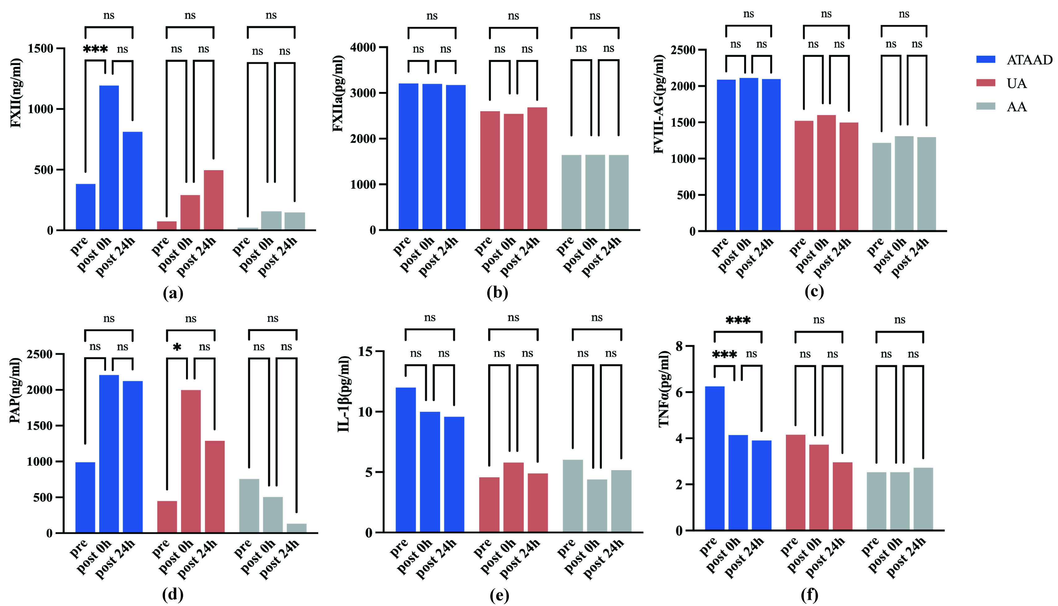 The effects of the different groups and phases on the concentrations of FXII, FXIIa, FVIII-Ag, and PAP are presented in Fig. 1. Preoperatively (immediately prior to anesthesia induction), compared with those in the other two groups, patients with ATAAD presented with significantly higher levels of FXIIa (p = 0.014 and p
