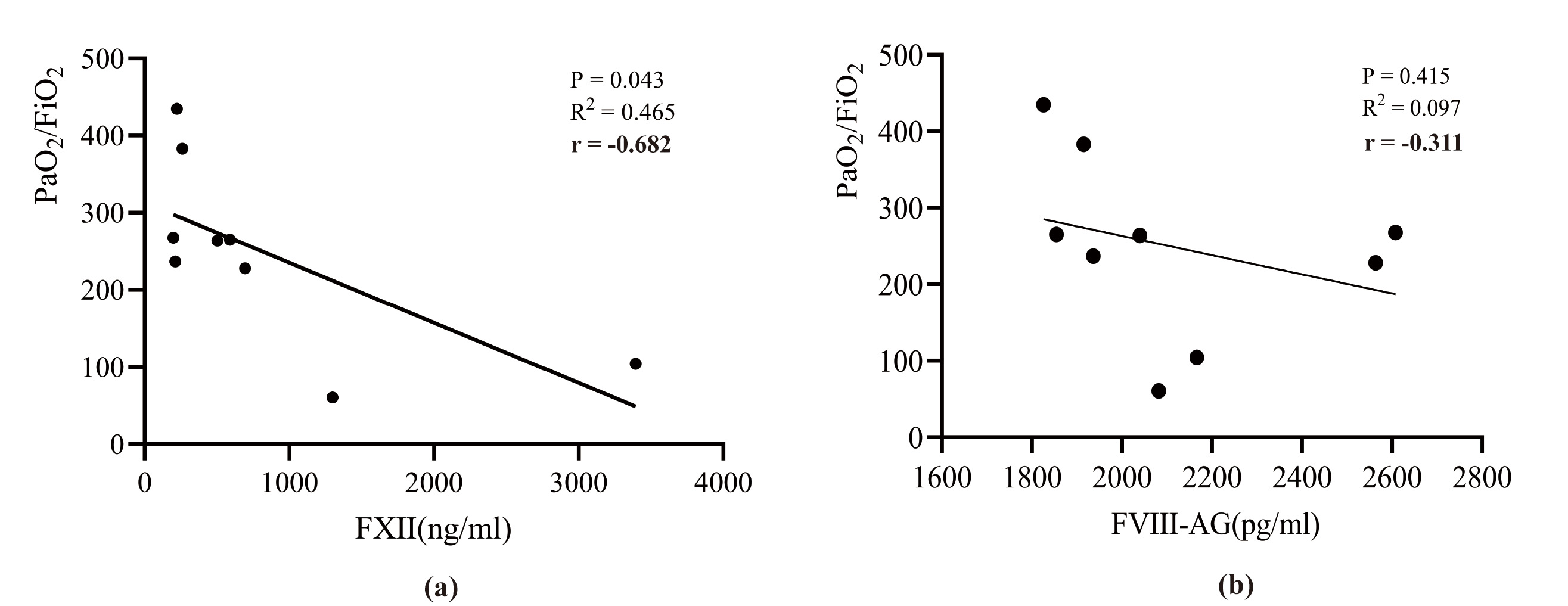 Fig. 3. The correlation between coagulation factors and oxygenation index in patients with ATAAD. (a) Association of FXII concentration with PaO2/FiO2; (b) Association of FVIII-Ag concentration with PaO2/FiO2. PaO2/FiO2, oxygenation index; FXII, factor XII; FVIII-Ag, factor VIII-related antigen.