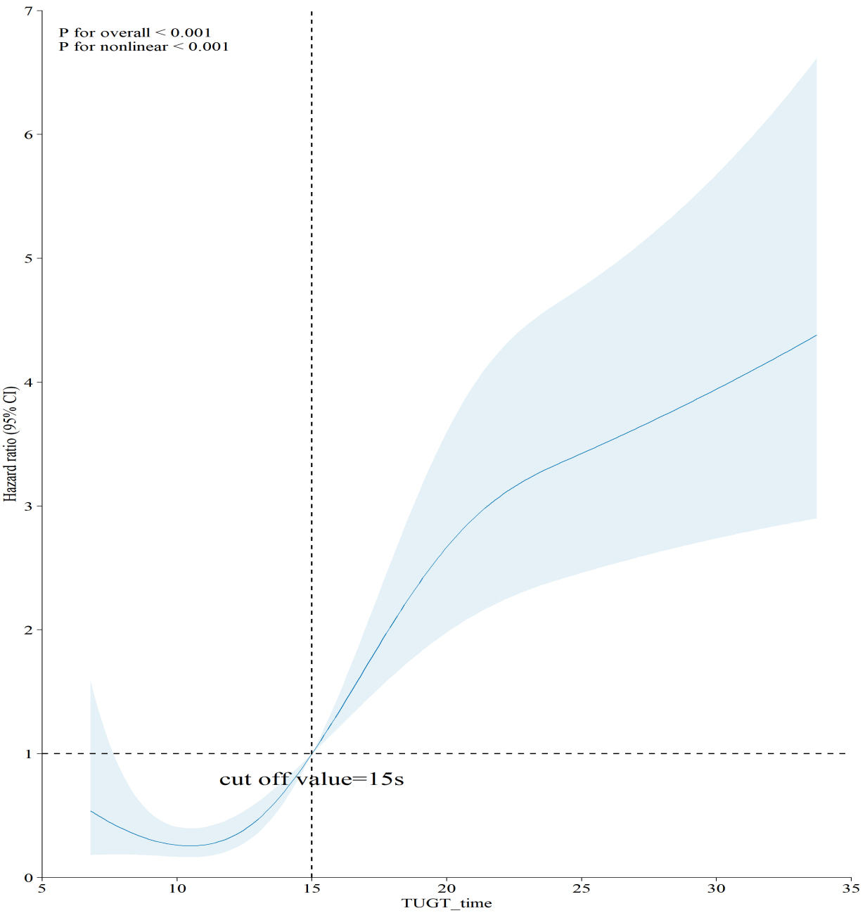 Baseline continuous variables were summarized using either the mean and standard deviation (SD) or the median and interquartile range (IQR), depending on the distribution of the data. Categorical variables were presented as frequencies and proportions. For normally distributed continuous variables, Student’s t-test was used to compare data between groups. For non-normally distributed continuous variables, the Mann–Whitney U test was applied to compare data between groups. For categorical variables, the Chi-square test was utilized to compare data between groups. Restricted cubic splines were employed to investigate and visualize the relationship between TUGT time and 5-year all-cause mortality. Univariable and multivariable Cox proportional hazards analyses were conducted to identify factors associated with all-cause mortality over the 5-year period. Kaplan-Meier curves based on different TUGT groups were used to visualize the probability of survival over time. The log-rank test was applied to compare survival rates between these groups. In this study, variance inflation factor (VIF) values were computed for all predictors. A stepwise elimination procedure was applied, removing the variable with the highest VIF in each iteration until all remaining variables had VIF values below 5. To identify independent predictors of survival, Cox proportional hazards regression analysis was performed. A stepwise variable selection procedure based on Akaike’s Information Criterion (AIC) was applied using backward elimination. Starting from the full model, variables were sequentially removed to minimize the AIC value, aiming to achieve a parsimonious model. The final multivariable Cox model included covariates retained after stepwise selection. All statistical tests were two-tailed, and a p-value of