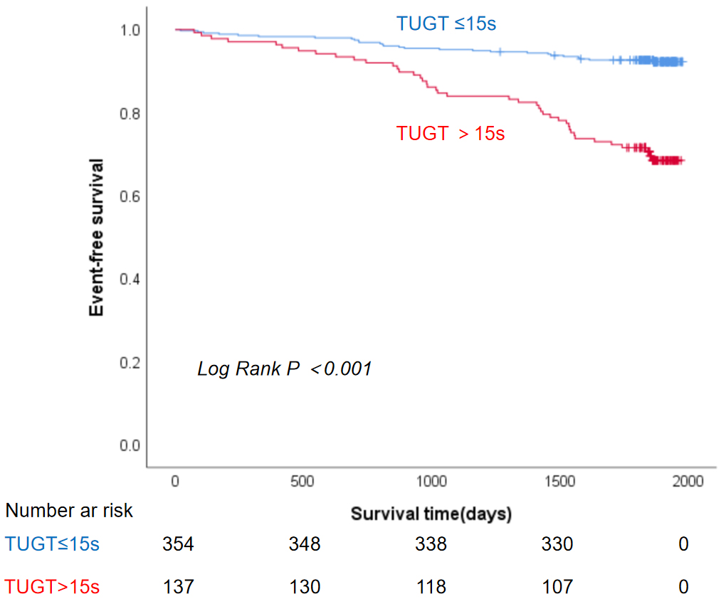 This prospective cohort study was conducted at the Beijing Hospital in China from September 2018 to April 2019, with a follow-up period of 5 years. Patients underwent the TUGT at baseline and were categorized into two groups based on the subsequent results: Group 1 (TUGT >15 s) and Group 2 (TUGT ≤15 s). The primary outcome of the study was all-cause mortality over five years.
