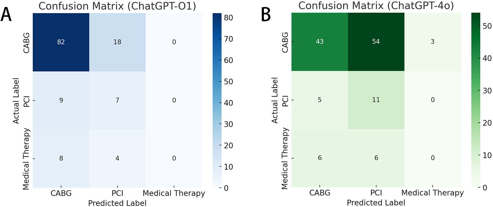The two confusion matrices highlight the differences in classification performance between ChatGPT o1 and 4o (Fig. 1A,B). Both models correctly identified most CABG cases (82 vs. 43 true positives), but ChatGPT 4o demonstrated a higher rate of misclassification of CABG cases as PCI (54 cases).