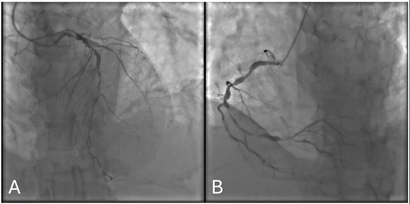 Findings: Significant multivessel lesions involving the LAD, CX (Fig. 2A), and RCA (Fig. 2B), with a valvular pathology.