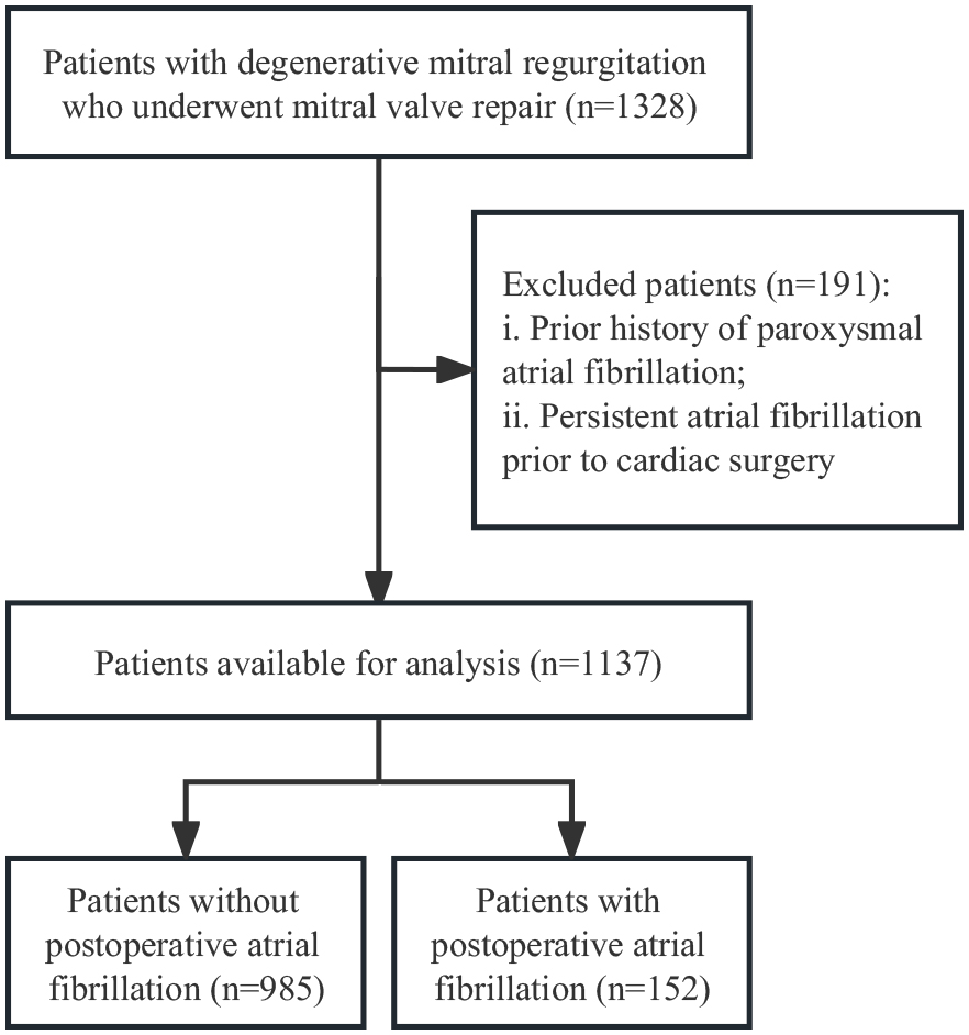 Postoperative atrial fibrillation (POAF) is the most common postoperative cardiac arrhythmia and has been reported to occur in up to 46.7% of patients after mitral valve surgery [7]. The pathophysiology of atrial fibrillation (AF) is complex and multifactorial, and several risk factors have been identified, including age, hypertension, diabetes mellitus, and preoperative atrial enlargement [8]. However, the risk factors for acute POAF specifically in patients with DMR who undergo surgical repair of mitral valves are not well understood. Therefore, the aim of this study is to investigate the risk factors for the occurrence of acute POAF in patients with DMR following surgical repair of mitral valves.