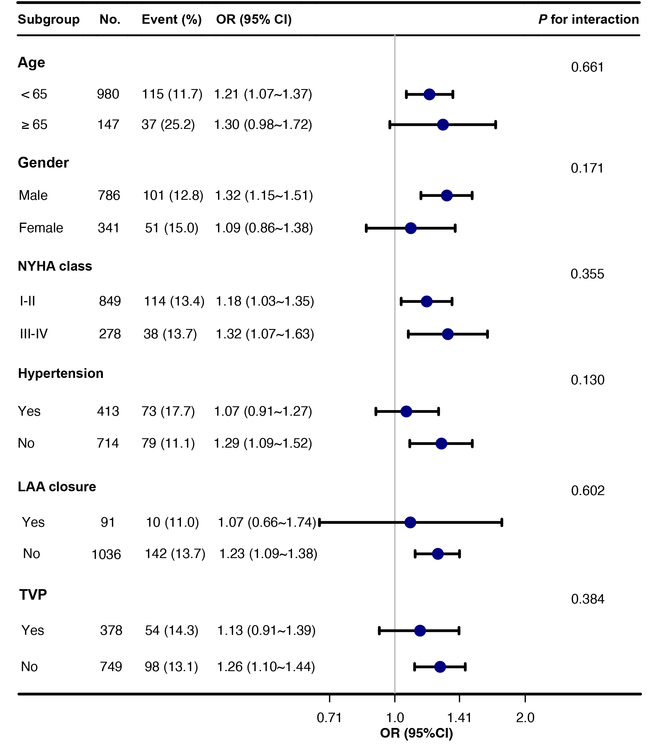Fig. 2. Subgroup analyses of IVS thickness and POAF. Abbreviations: CI, confidence interval; IVS, interventricular septum; LAA, left atrial appendage; NYHA, New York Heart Association; OR, odds ratio; POAF, postoperative atrial fibrillation; TVP, tricuspid valvuloplasty.