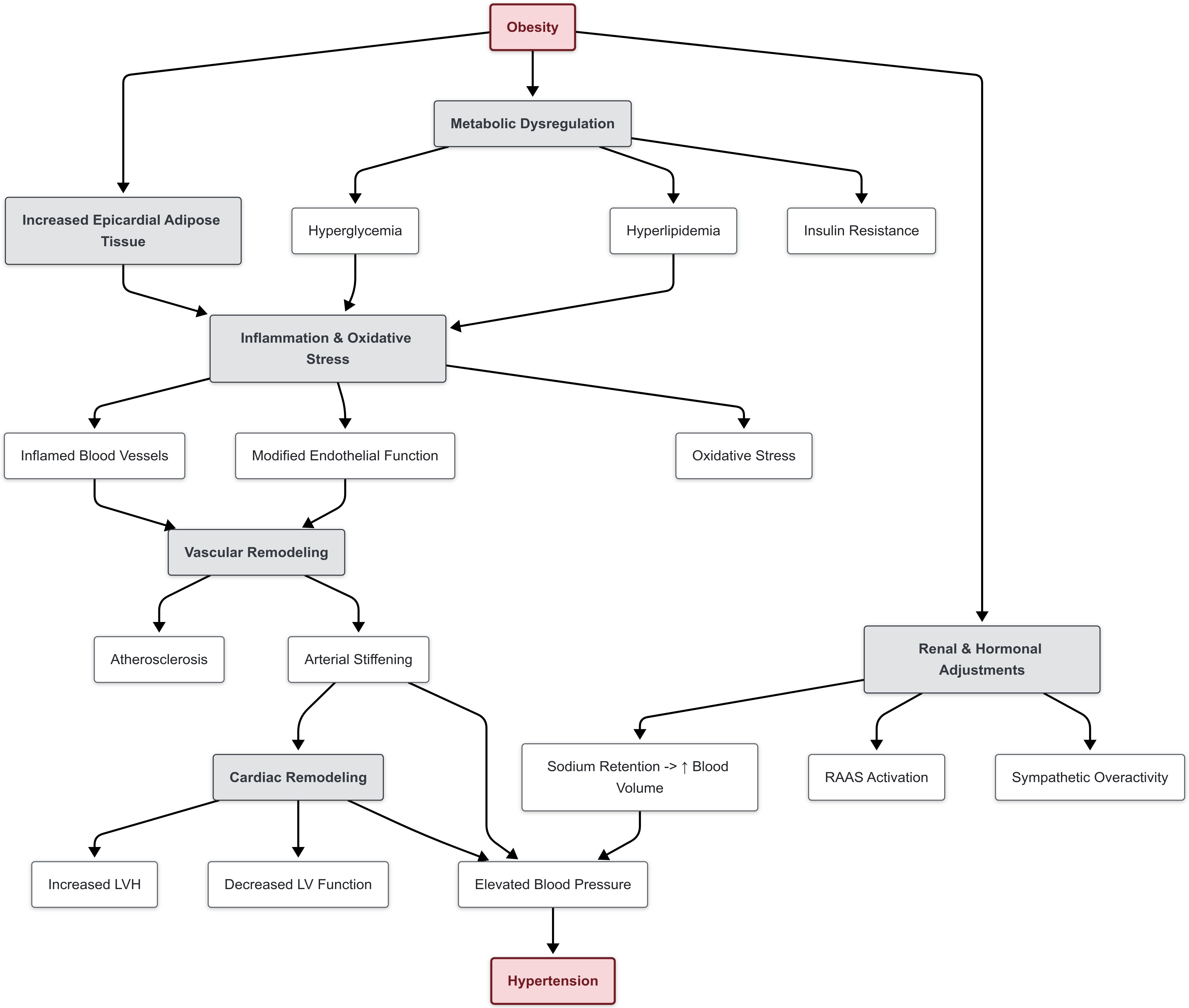 Pathophysiological mechanisms in which hyperinsulinemia can contribute to elevated blood pressure include the impairment of cell membrane ion-exchange, enhanced sympathetic and renin-angiotensin aldosterone system activation, sodium retention, volume expansion, left ventricular hypertrophy (LVH), and atherosclerosis [28]. Higher insulin levels and insulin resistance at the age of 13 are linked to both elevated blood pressure and hyperlipidemia by the age of 16 [29]. Impaired SNS activity is associated with elevated heart rate and blood pressure, and has also been linked to visceral obesity, metabolic abnormalities, and immune phenomena in pediatric patients with hypertension [12]. The results of the Bogalusa Heart Study associated increased heart rate with higher blood pressure and adiposity. As such, visceral obesity is a phenotypic feature of children with hypertension and can lead to greater sympathetic activity [13]. Oxidative stress, quantified by superoxide or oxidative stress markers, has also demonstrated to be elevated in children with primary hypertension irrespective of body mass index (BMI), while being correlated with hypertension mediated tissue damage [30].