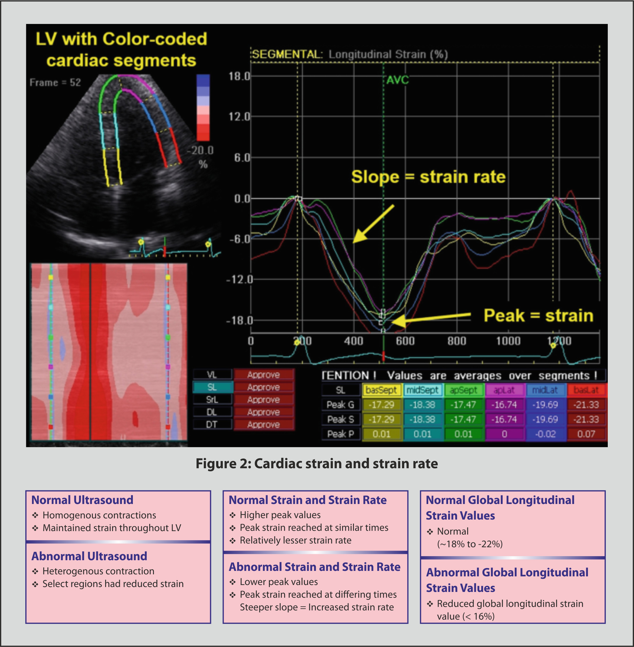 Cardiac strain assesses the left ventricular systolic function and can be measured with Doppler ultrasound to determine velocities of myocardial tissue movement. Additionally, speckle tracing is an ultrasound-based technique that tracks natural acoustic markers across frames, offering angle independence relative to tissue doppler imaging but with reduced resolution due to lower frame rate (Fig. 2, Ref. [77, 78]). Being able to measure the strain present in the left ventricle allows to detect the effort at which the heart pumps, with greater strain indicating greater risk for cardiovascular diseases such as hypertension [77].