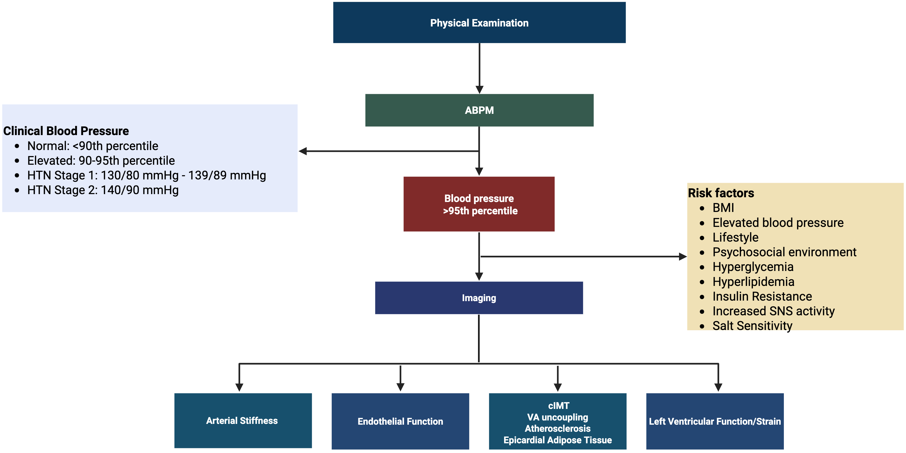 Fig. 3. Hypertension diagnosis algorithm. Clinical blood pressure guidelines were derived from the American Academy of Pediatrics. Created in BioRender. https://BioRender.com/x97o1c1. Abbreviations: ABP, ambulatory blood pressure; BMI, body mass index; cIMT, carotid intima-media thickness; HTN, hypertension; mmHg, millimeter of mercury; SNS, sympathetic nervous system; VA uncoupling, ventricular arterial uncoupling.