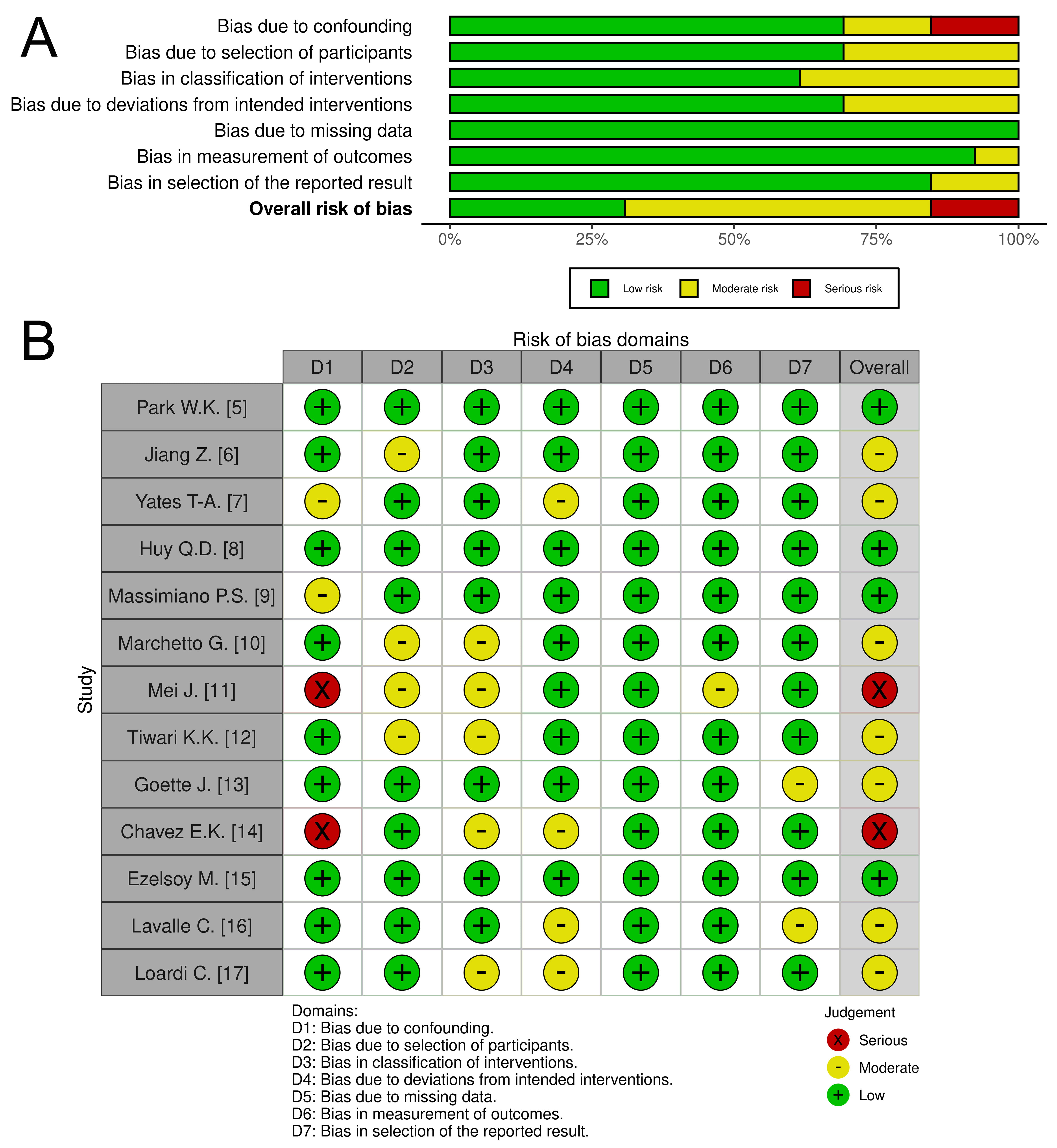 Fig. 1. The quality assessment of included studies. Comments: (A) Risk of bias graph: Illustrates the distribution of bias judgments (low, moderate, serious, critical) across all assessed domains, presented as percentages. (B) Risk of bias summary: Provides a detailed breakdown of bias assessments for each individual study.