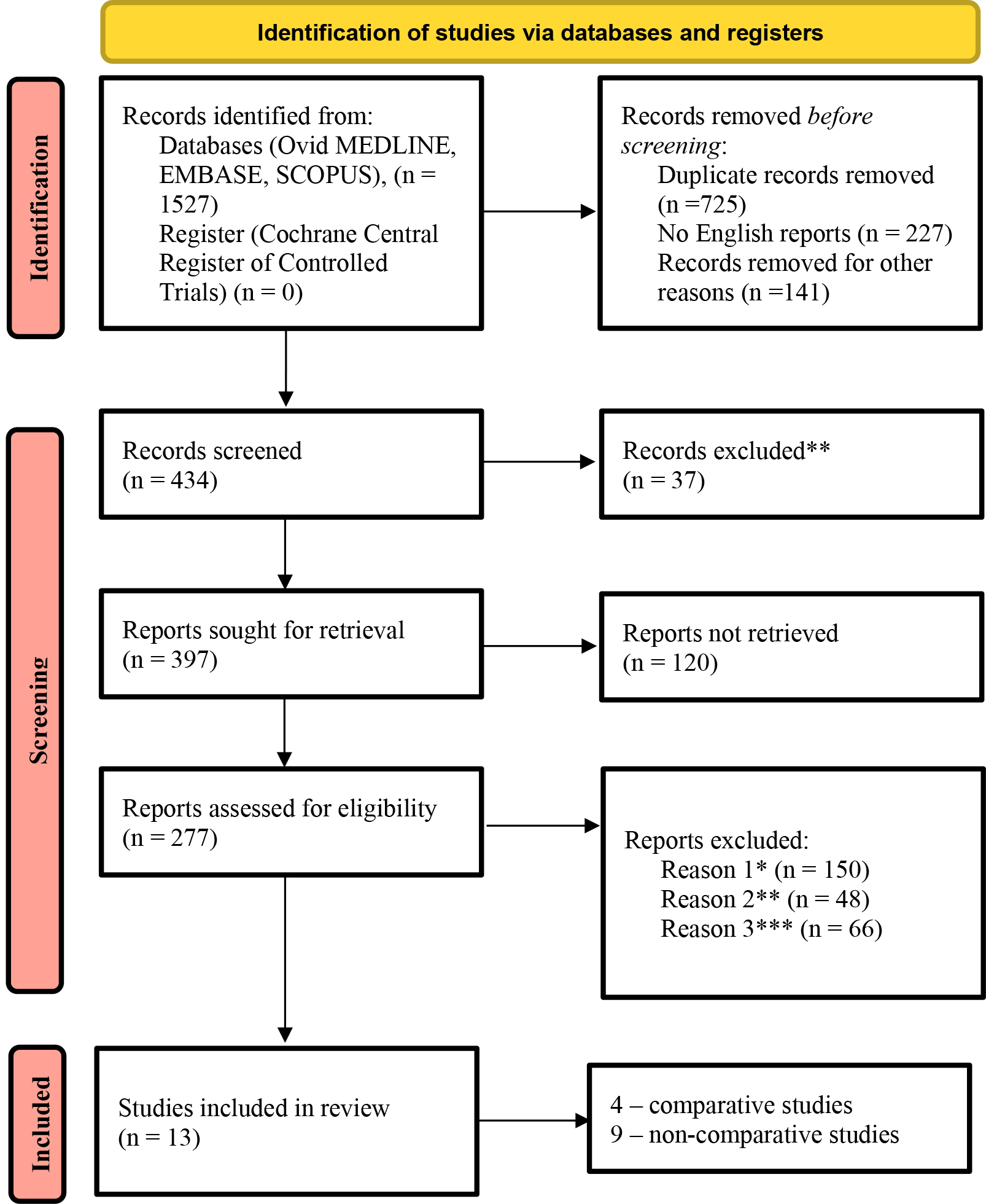 Fig. 2. PRISMA flow diagram of included studies. Comments: *existence of concomitant cardiac surgeries (aortic valve surgery, aortic surgery, coronary artery bypass grafting (CABG)), **lack of data on primary and secondary endpoints, ***lack of sufficient data regarding baseline patient characteristics.