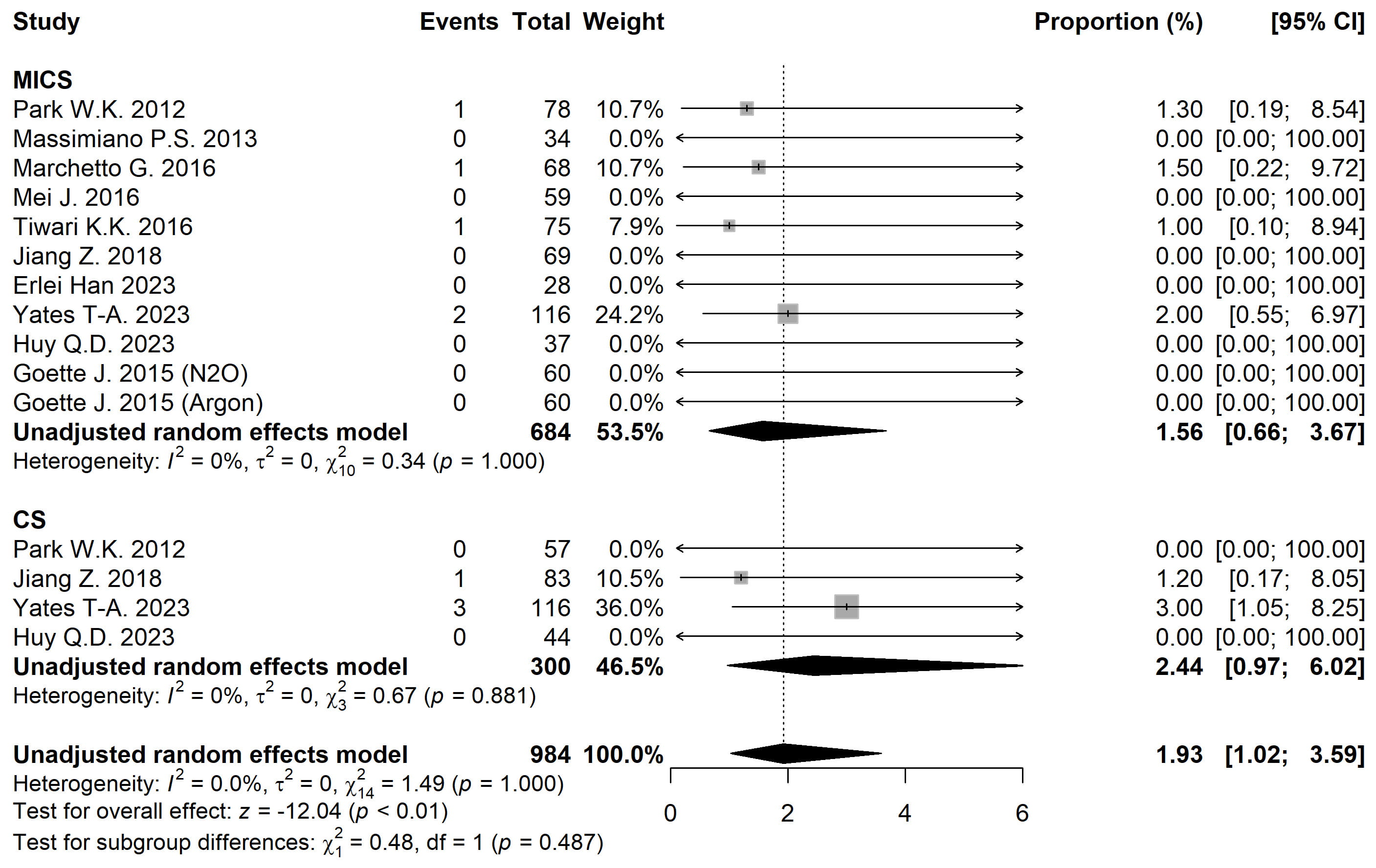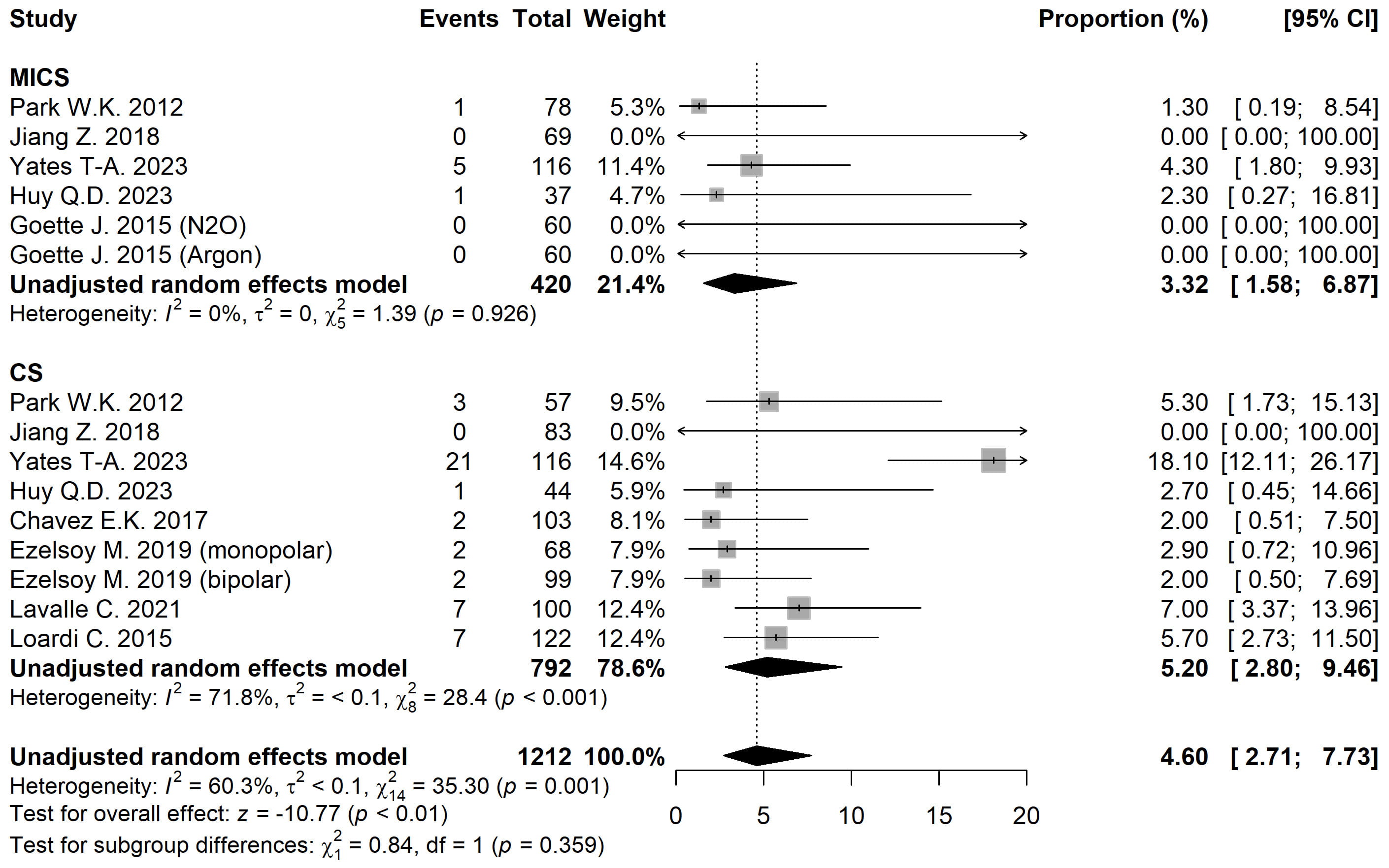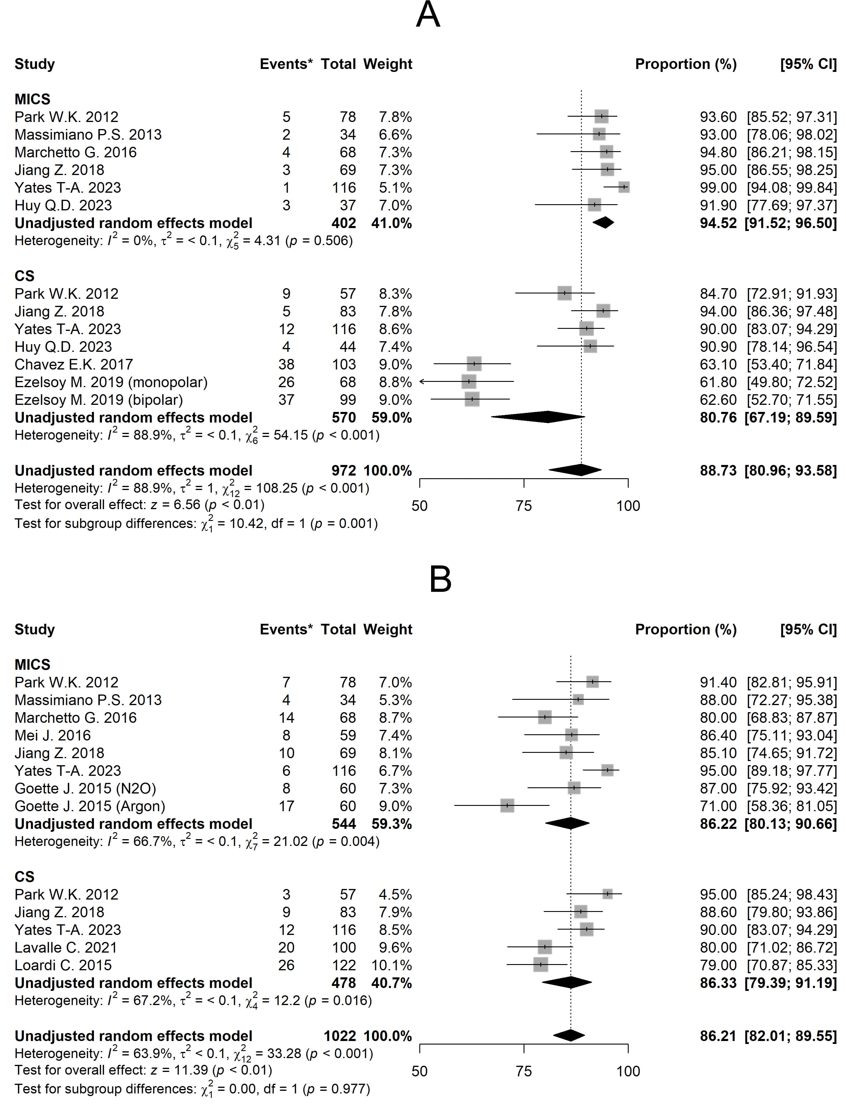 The mean freedom from AA for 1 year of MICS and CS was 94.52% [95% CI 91.52, 96.50] and 80.76% [95% CI 67.19, 89.59] respectively (Fig. 3A). Linear meta-regression results for all outcomes are presented in Table 2, with MICS as the baseline reference. Considering the moderators, no statistically significant differences between groups were found (p = 0.95).