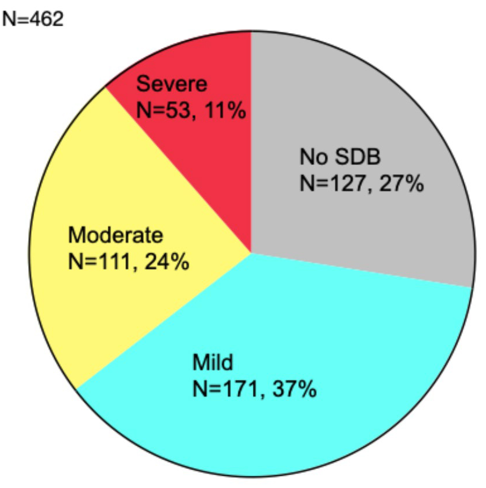 Severity and prevalence of SDB. SDB was observed in 335 patients (72.5%). SDB, sleep-disordered breathing.