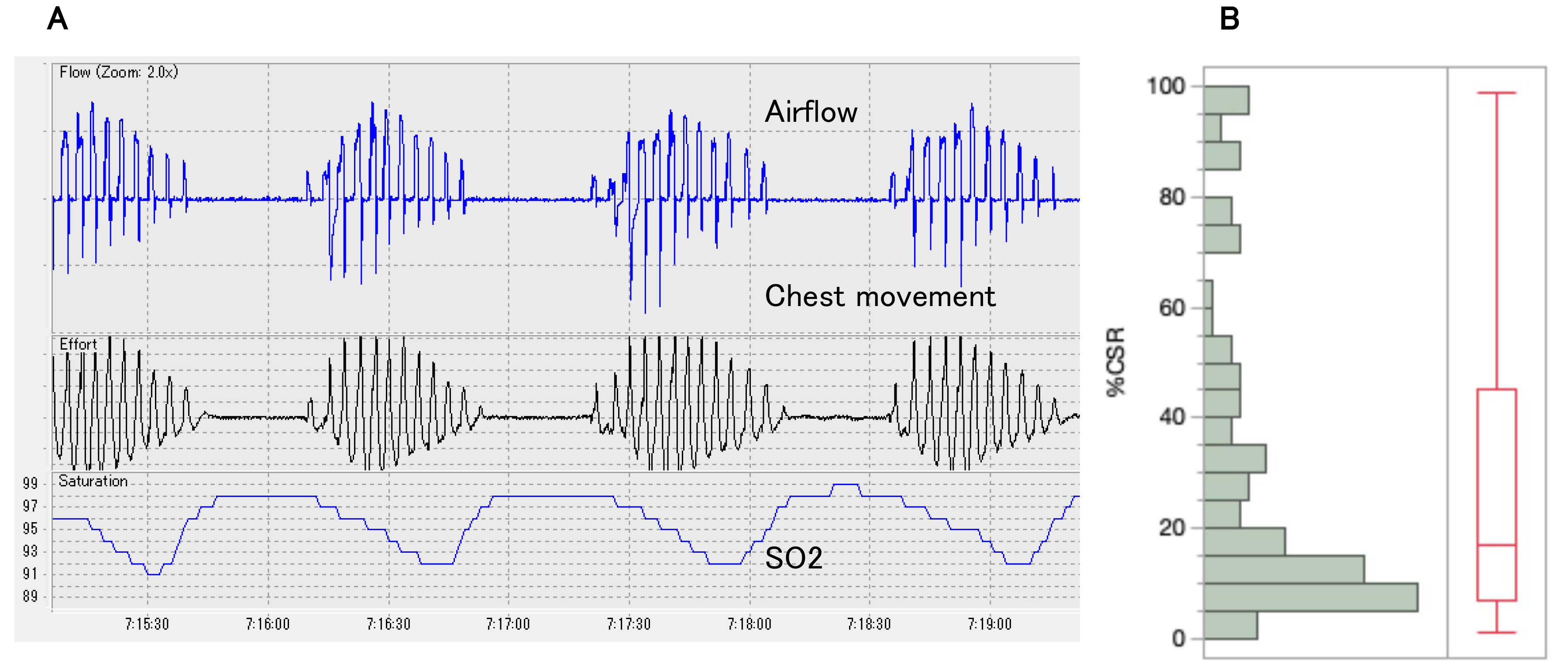 CSR observed in this study. (A) Typical CSR pattern: CSR is characterized by repetitive central apneas alternating with hyperventilation in a crescendo-decrescendo tidal volume pattern. (B) Distribution of %CSR: In patients with CSR (n = 107), the median %CSR was 17% (interquartile range, 7–45). CSR, Cheyne-Stokes respiration.