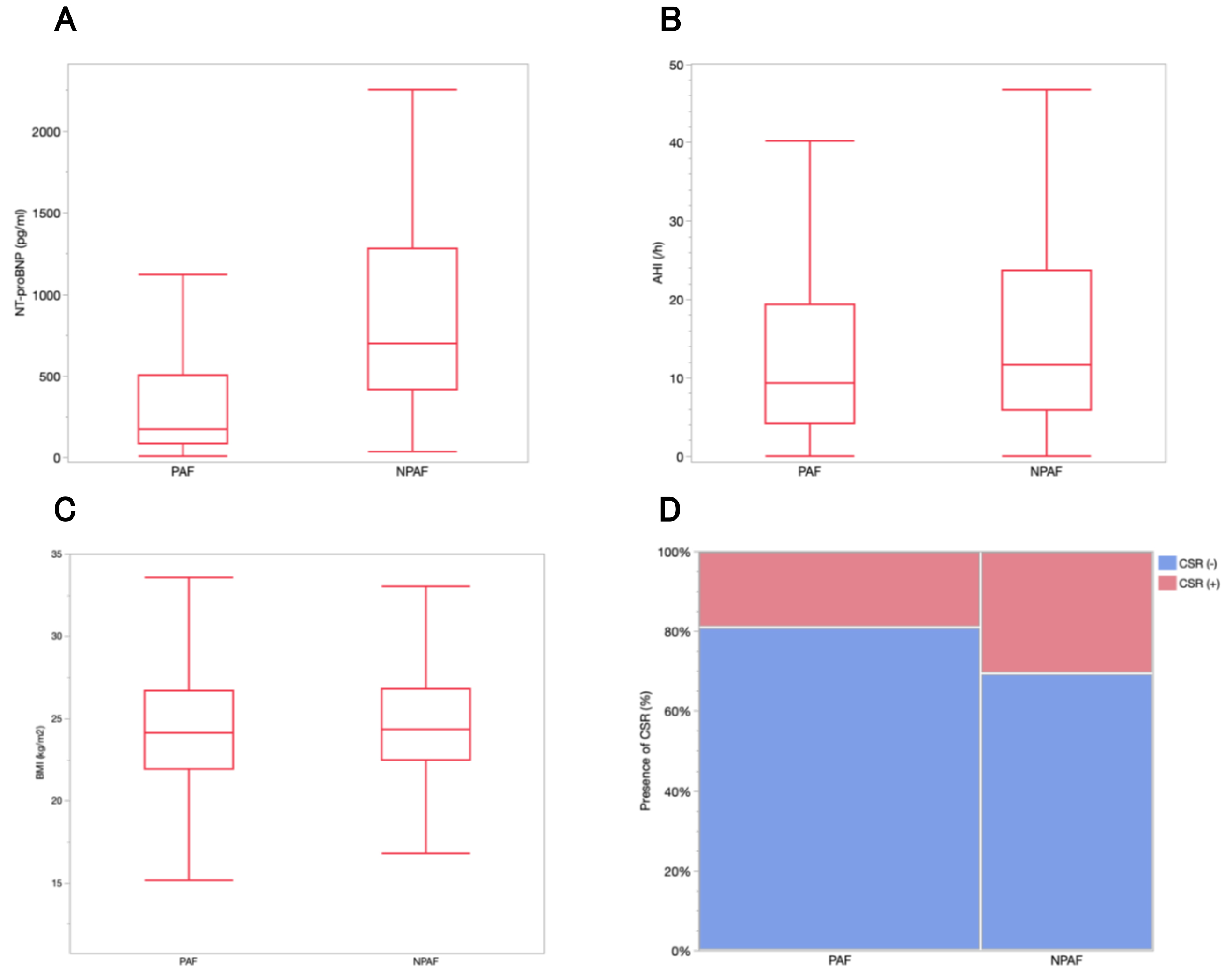 The findings of this study were as follows: (1) 72.5% of AF patients had SDB; (2) 23.1% of AF patients had CSR; (3) AHI was associated with age, sex, BMI, and hypertension; and (4) the presence of CSR was associated with older age, DM, and elevated NT-proBNP levels, suggesting that in patients with AF, SDB is highly prevalent, particularly among older, obese men with hypertension. CSR is also prevalent, particularly among older patients with diabetes and high LV filling pressure. Since specific data regarding CSR in AF patients without LV systolic dysfunction are lacking, the finding that 23% of these patients have CSR—along with the abovementioned correlates that are similar to those seen in other patient populations—represents a novel and significant contribution of the present study. The correlates of AHI and CSR identified in the present study are plausible. In the general population, factors such as age, male sex, BMI, and comorbid hypertension are associated with increased AHI. Additionally, in other patient populations, older patients with elevated LV filling pressure are more likely to exhibit CSR. Moreover, limited data suggest that patients with DM may experience CSR, even in the absence of AF [20, 21].