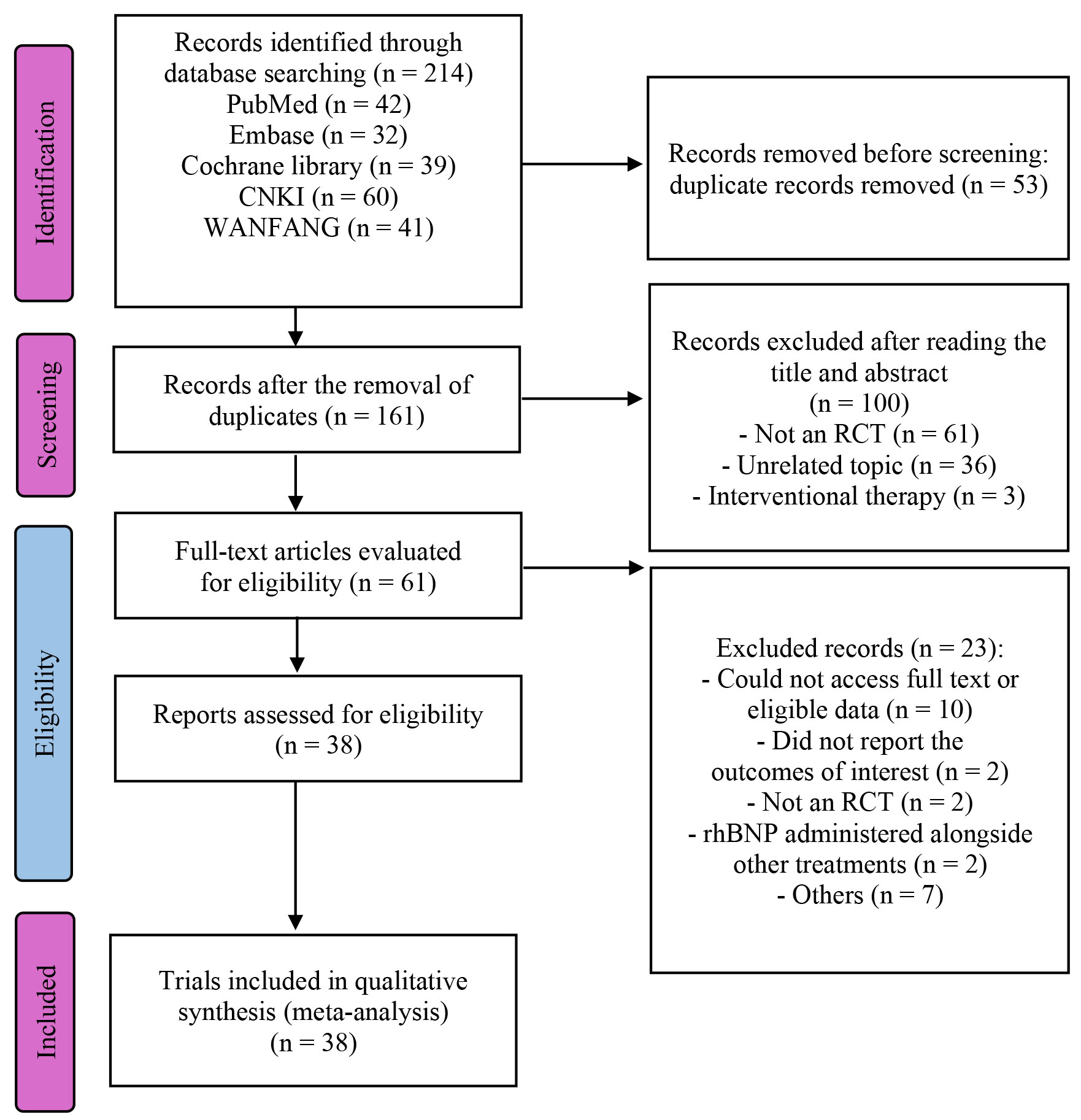 A total of 214 trials were identified following the preliminary screening. After excluding duplicates and non-eligible studies, and following a thorough review of full texts and references, 38 RCTs encompassing 2280 participants were selected for detailed analysis [11, 12, 13, 14, 15, 16, 17, 18, 19, 20, 21, 22, 23, 24, 25, 26, 27, 28, 29, 30, 31, 32, 33, 34, 35, 36, 37, 38, 39, 40, 41, 42, 43, 44, 45, 46, 47, 48]. Fig. 1 provides a visual representation of the publication selection process and its outcomes; meanwhile, Supplementary Table 1 offers a concise overview of the included trials and an assessment of the methodologies employed.