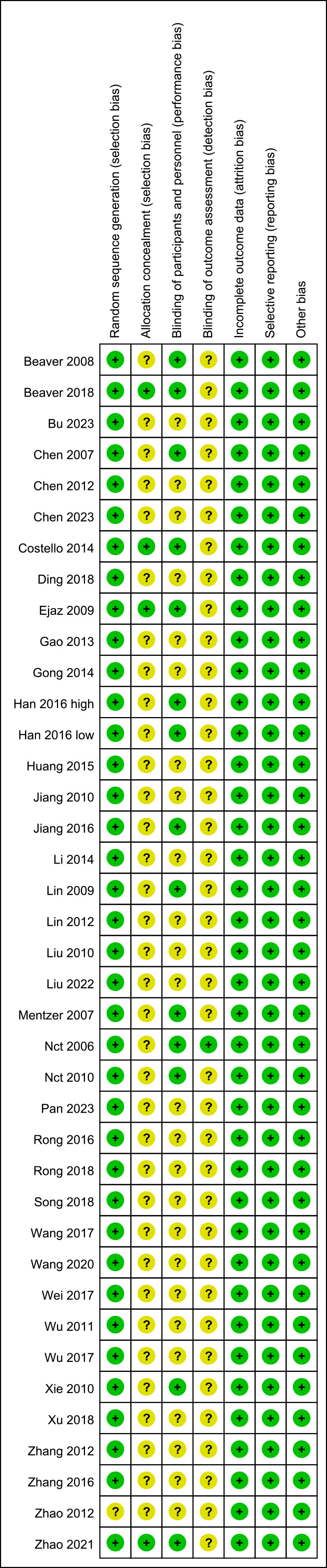 Two independent reviewers assessed the risk of bias in the studies using the Cochrane risk of bias map. As is shown in Fig. 2, the studies had little bias in randomization, incomplete data, and selection reporting. Meanwhile, a moderate level of bias existed in allocation concealment and blinding.
