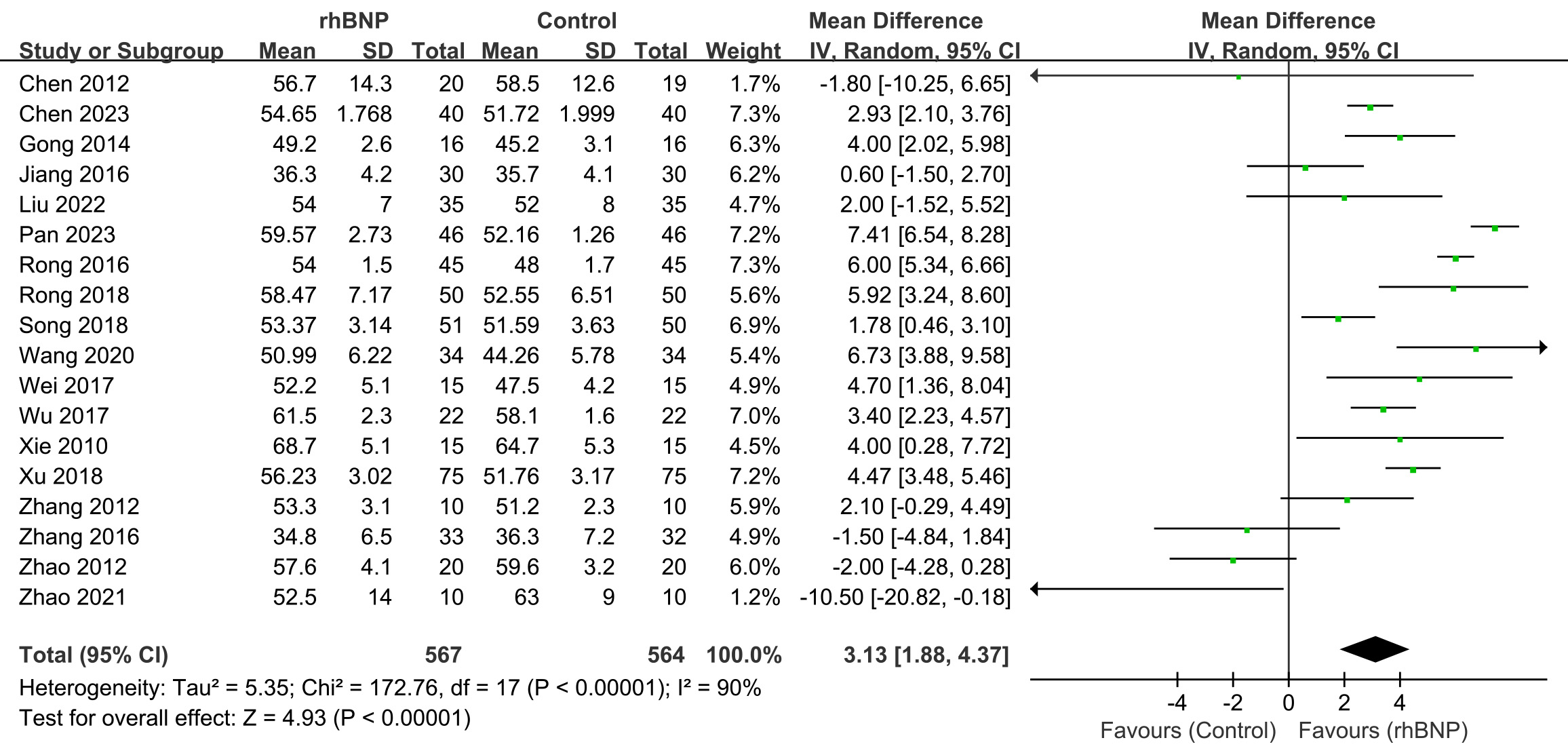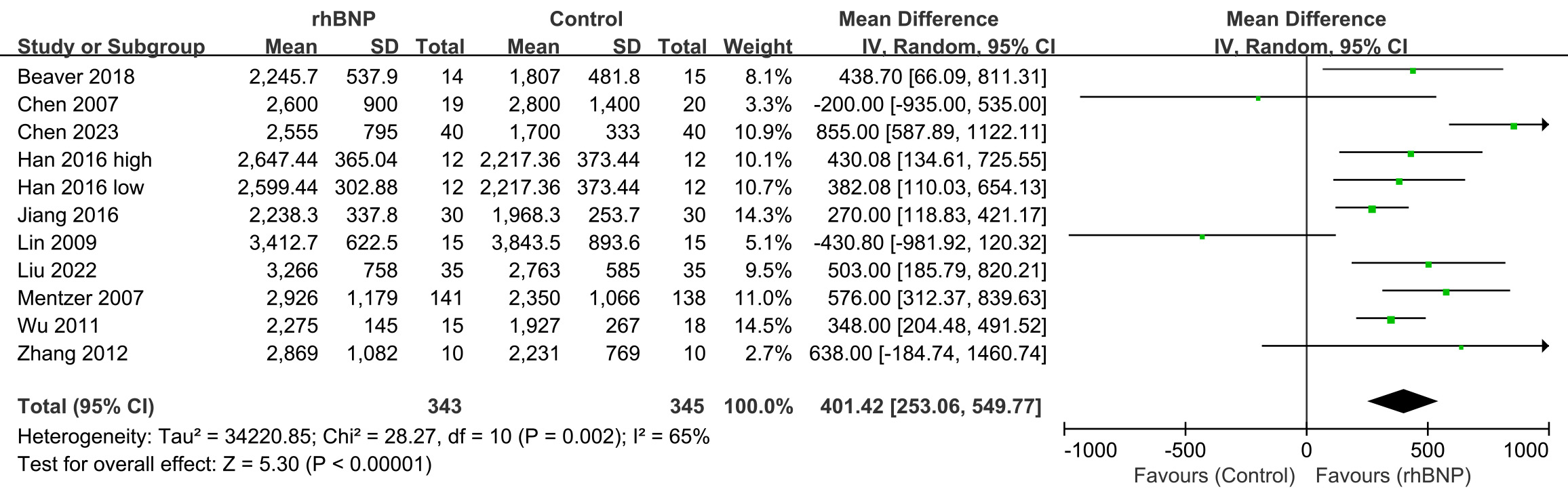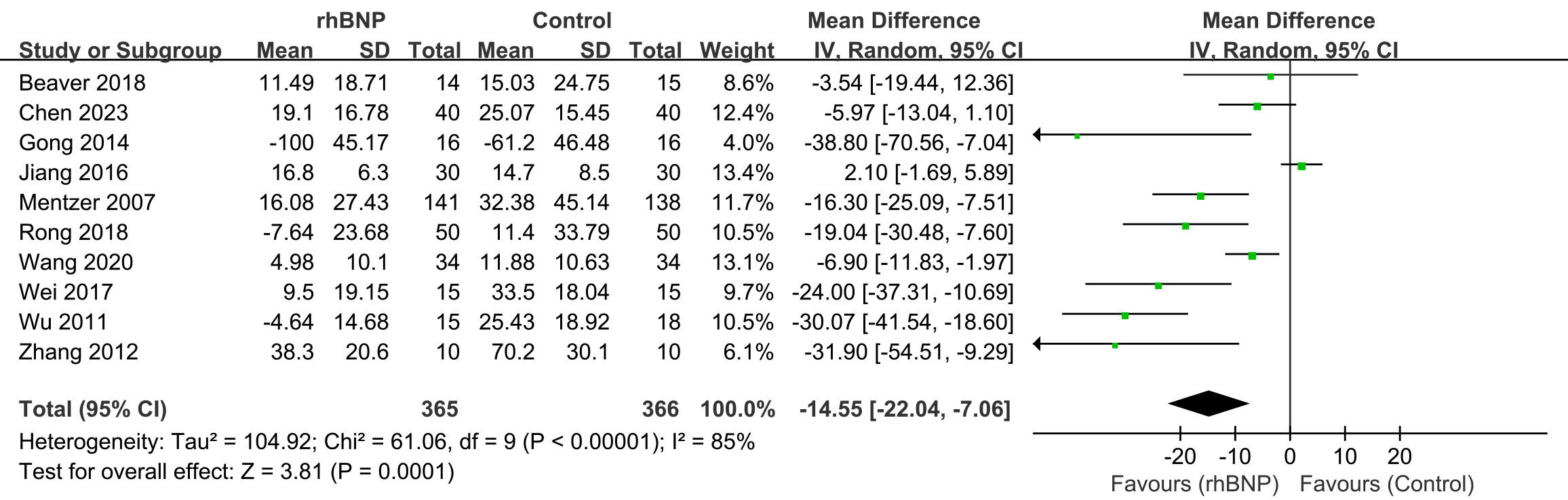 Our meta-analysis included 38 RCTs encompassing 2280 patients. The use of rhBNP in the perioperative period significantly enhanced LVEF compared to the control group (mean difference = 3.13 (95% CI [1.88, 4.37]; p < 0.00001). Additionally, rhBNP administration was associated with a significant increase in the 24-hour urine volume (mean difference = 401.42, 95% CI [253.06, 549.77]; p < 0.00001) and an improvement in eGFR (mean difference = 13.94, 95% CI [5.57, 22.31]; p = 0.001). Meanwhile, perioperative administration of rhBNP significantly reduced SCr levels (mean difference = –14.55, 95% CI [–22.04, –7.06]; p < 0.0001). In addition, rhBNP significantly decreased PAP, the incidence of AEs, the duration of respiratory support, ICU LOS, hospital LOS, and TNF-α levels.
