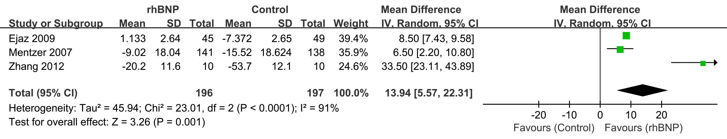 Fig. 3. Comparison of left ventricular ejection fraction (LVEF). rhBNP, recombinant human brain natriuretic peptide; SD, standard deviation; df, degrees of freedom.