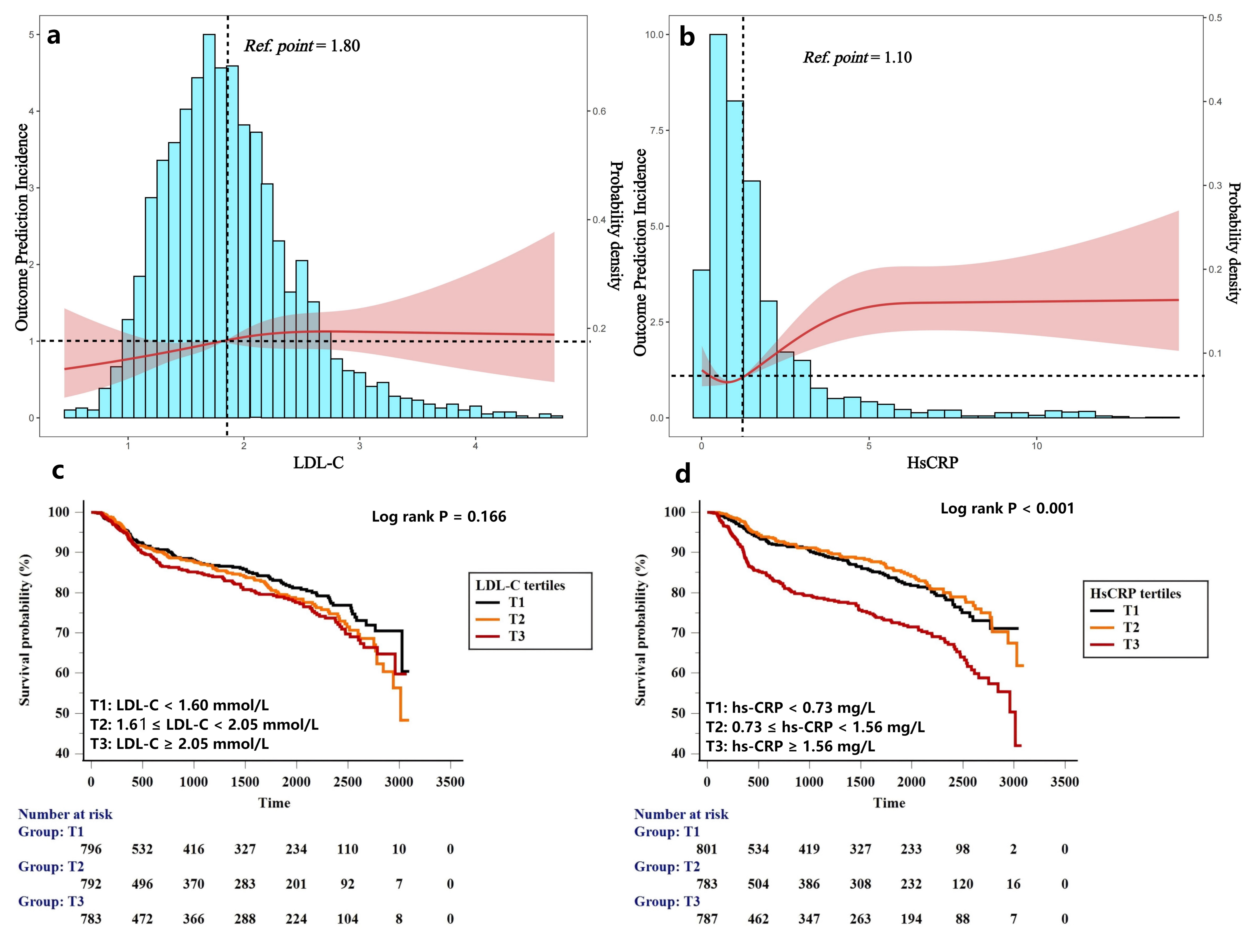 Fig. 1. Distribution of LDL-C and hs-CRP levels among PCI-treated patients and RCS plots for the association with MACCEs (a,b). Kaplan-Meier curves for MACCEs based on tertiles of LDL-C and hs-CRP levels (c,d). LDL-C, low-density lipoprotein cholesterol; hs-CRP, hypersensitive C-reactive protein; PCI, percutaneous coronary intervention; RCS, restricted cubic spline; MACCE, Major adverse cardiovascular and cerebrovascular event.