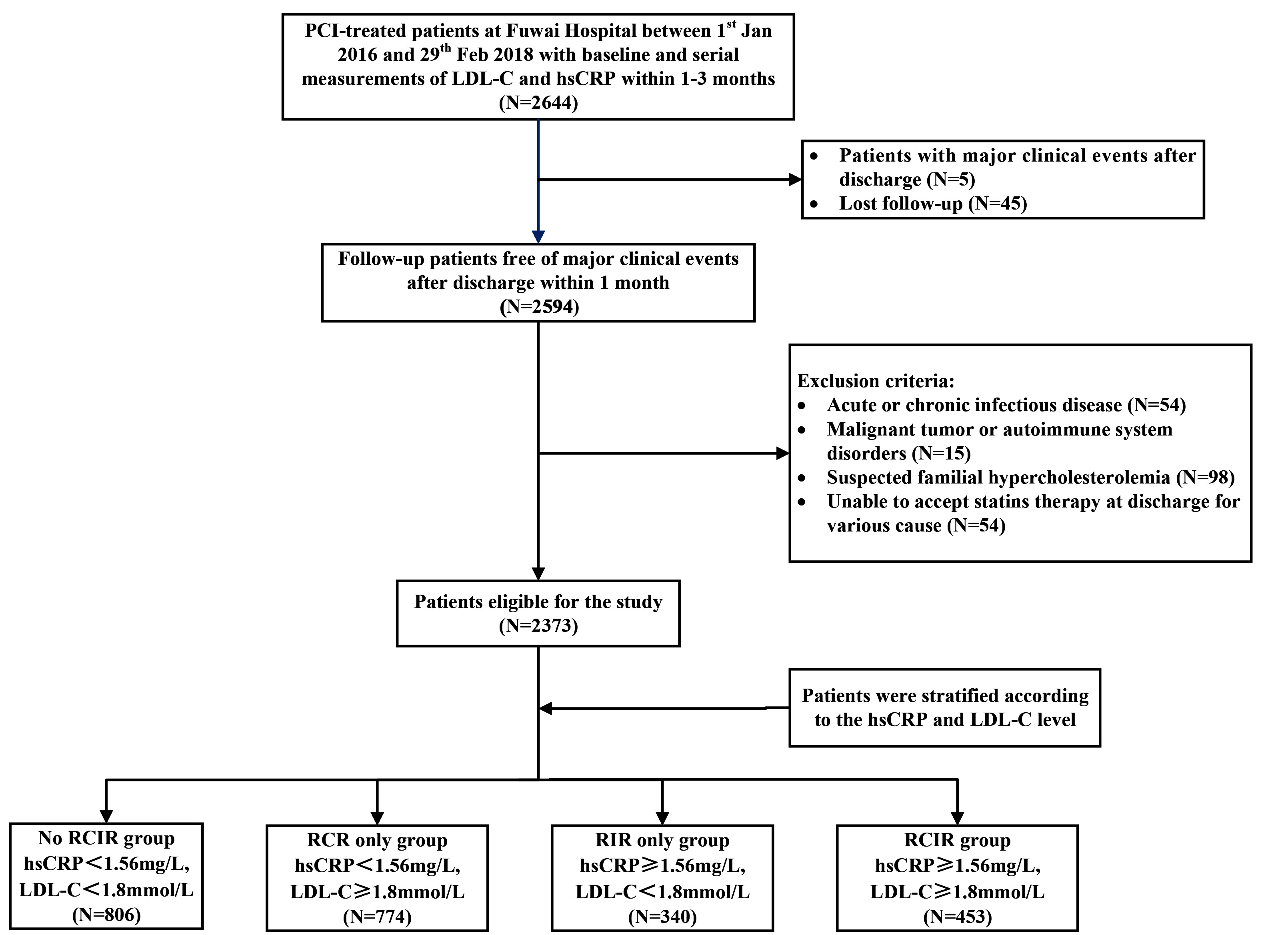 A total of 2644 consecutive participants with serial monitoring of hs-CRP and LDL-C values were recruited into study. The exclusion criteria included: (1) Failure to complete at least a 12-month follow-up (N = 45); (2) Major adverse clinical events before the latest measurement within 3 months after PCI procedure (N = 5); (3) Acute or chronic infectious diseases (N = 54); (4) Malignant tumors or autoimmune system disorders (N = 15); (5) Suspected familial hypercholesterolemia (N = 98); (6) Unable to accept statin therapy at discharge (N = 54). Finally, 2373 participants were included in the analysis. The patients were classified into 4 groups according to high-risk LDL-C and hs-CRP cutoff values: no residual cholesterol and inflammatory risk (RCIR) group: hs-CRP