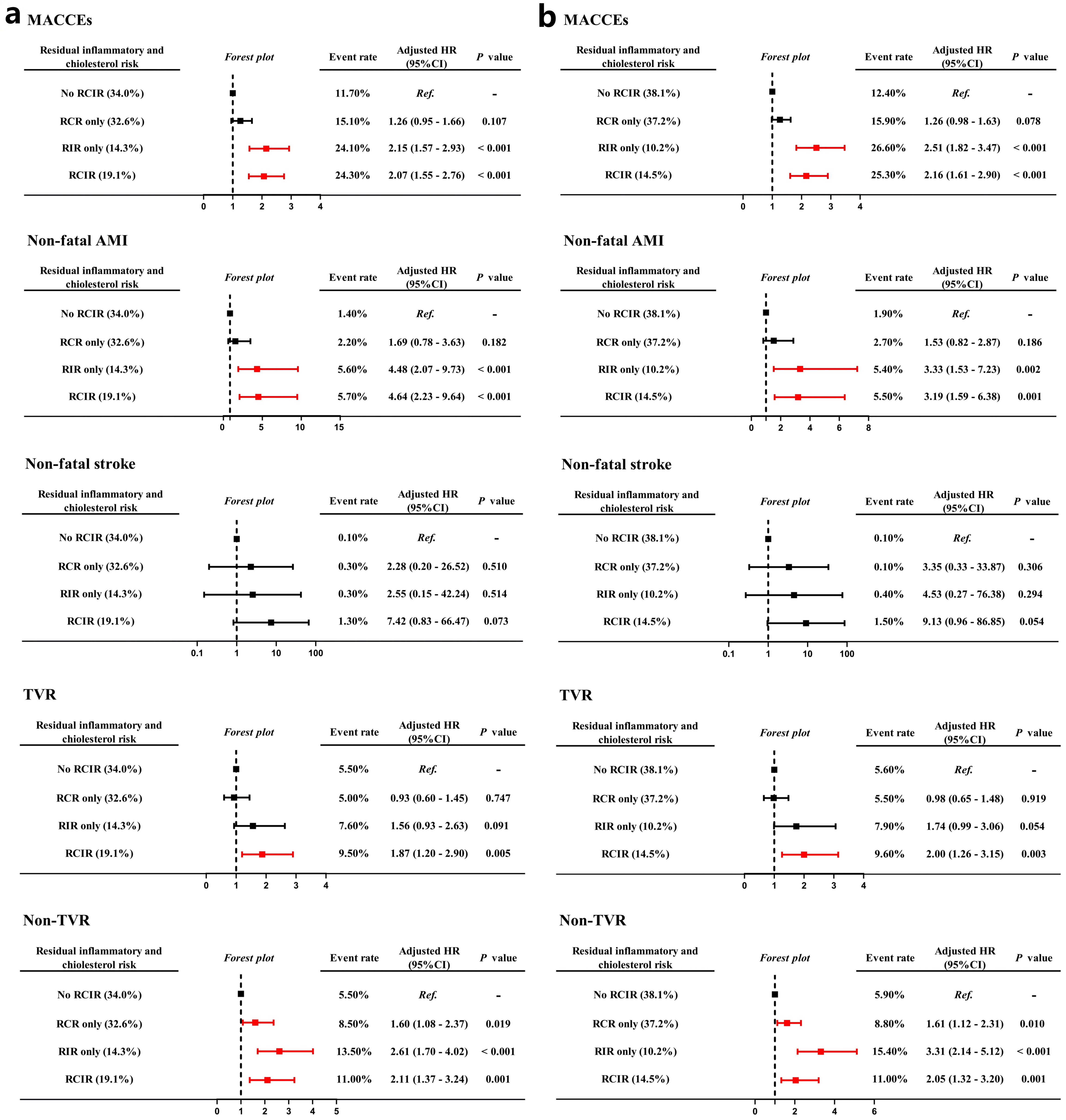 Fig. 4. Forest plots for risks of MACCEs, non-fatal AMI, non-fatal stroke, TVR and non-TVR based on different hs-CRP standards (East Asian standard (a), Western standard (b)) for residual inflammatory and cholesterol risk models. TVR, target vessel revascularization.
