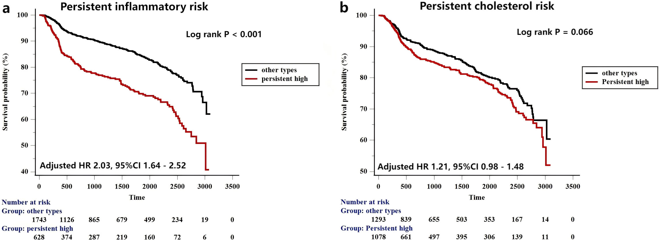 To further evaluate the impact of persistent residual risks on prognosis, we also evaluated the prognostic implications of persistent residual risk in the current study (Fig. 5). Persistent high inflammatory risk group was defined as patients with baseline and follow-up hs-CRP
