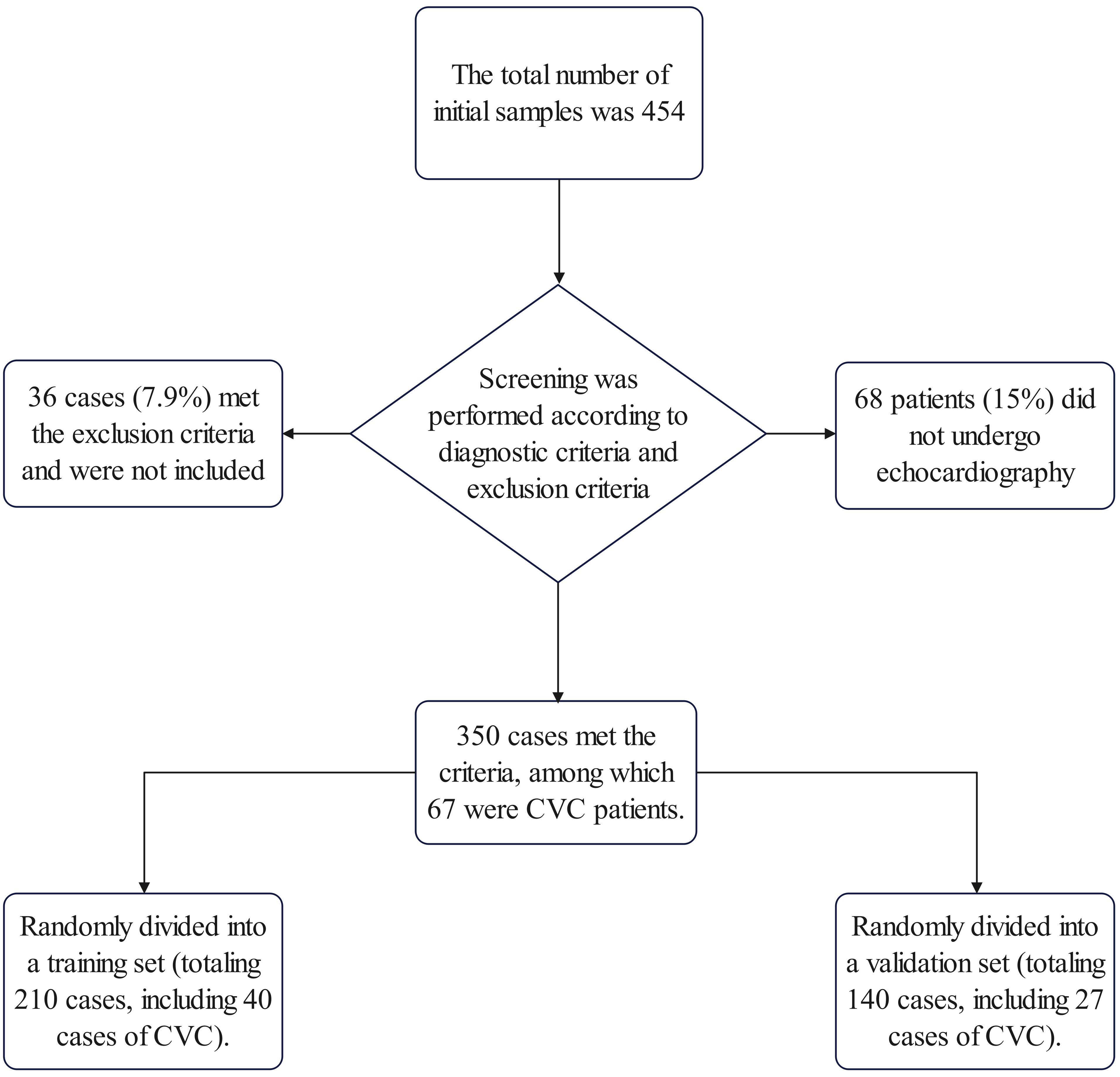 Collected data included demographic details (gender, age, duration of disease, history of hypertension) and clinical parameters. Venous blood was drawn on the day of admission for comprehensive laboratory tests: CRP, potassium, phosphorus, sodium, calcium, white blood cells (WBC), platelets (Plt), ESR, cyclic citrulline peptide antibody (CCP), rheumatoid factor (RF), complements C3, C1q, C4, immunoglobulin G (IgG), high-density lipoprotein (HDL), low-density lipoprotein (LDL), lipoprotein a, lipoprotein b, total cholesterol, triglycerides (TG), uric acid, hematocrit, hemocreatinine, cystatin C, albumin, pre-albumin and glucose. These markers were collected to explore possible systemic immune activity related to vascular and valvular pathology in RA, although their association with CVC remains uncertain. These samples were analyzed using a G9206 automatic biochemistry analyzer (Myriad Biomedical Co., Ltd., Shenzhen, China) and a Cobas E601 electrochemiluminescence immunoassay analyzer (Roche Diagnostics, Penzberg, Germany). Additionally, echocardiography and disease duration were recorded. Disease duration refers to the time since confirmed RA diagnosis. To ensure adequate representation of CVC cases and to maintain robust model validation despite the modest overall sample size, the data were randomly divided into a training set (60%) and a validation set (40%) using R software (R 4.3.1, Lucent Technologies, https://www.r-project.org/). The training set was utilized to construct the nomogram model, and the validation set was used to assess the model’s predictive efficacy.
