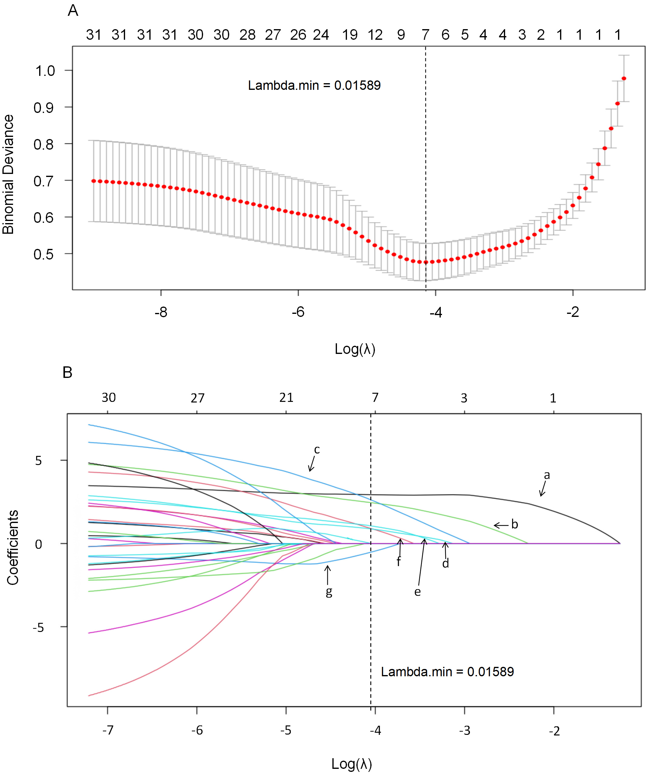 LASSO regression was applied to select variables with non-zero coefficients that may be predictive of CVC. The Lambda.min value (0.01589) was determined through 10-fold cross-validation to minimize binomial deviance. Selected variables were subsequently entered into univariate and multivariate logistic regression analyses. The 31 variables mentioned were included in the LASSO regression analysis, with Lambda.min serving as the cutoff point for screening the independent variables. At a Lambda value of 0.01589, seven variables with non-zero coefficients were identified: age, disease duration, hypertension, ESR, urea, cystatin C, and creatinine. The LASSO regression system profile and cross-validation results are illustrated in Fig. 2.
