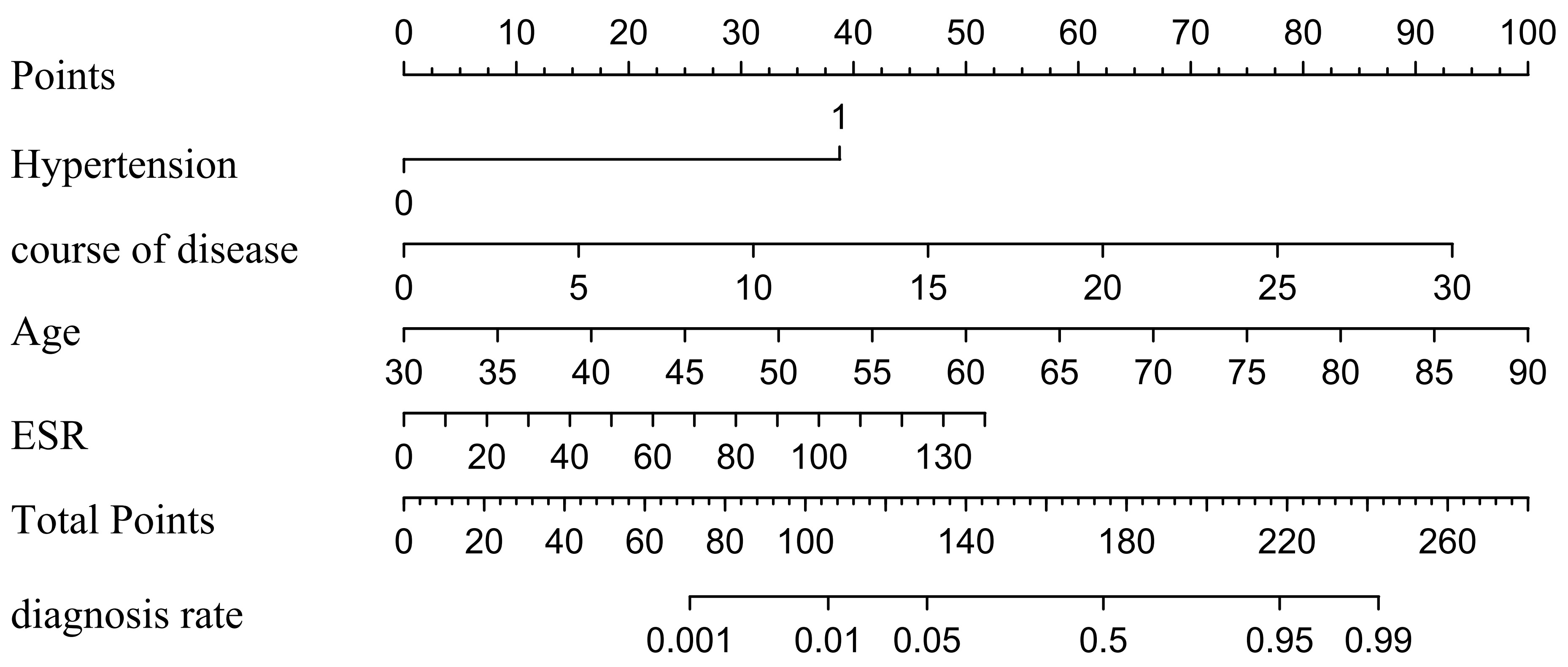 Importantly, the predictive model developed in this study incorporates both traditional cardiovascular risk factors and RA-specific indicators, such as ESR and disease duration, which reflect systemic inflammation and autoimmune burden. While hypertension and age are well-established risk factors for valve calcification, their inclusion alongside RA-specific markers adds novel clinical value. The use of a nomogram—a visual, user-friendly tool—allows for individualized risk estimation in clinical practice, facilitating early identification and intervention in high-risk RA patients. To our knowledge, this is the first study to construct such an integrative and quantitative model tailored to RA populations, addressing a critical gap in cardiovascular risk stratification for this group.
