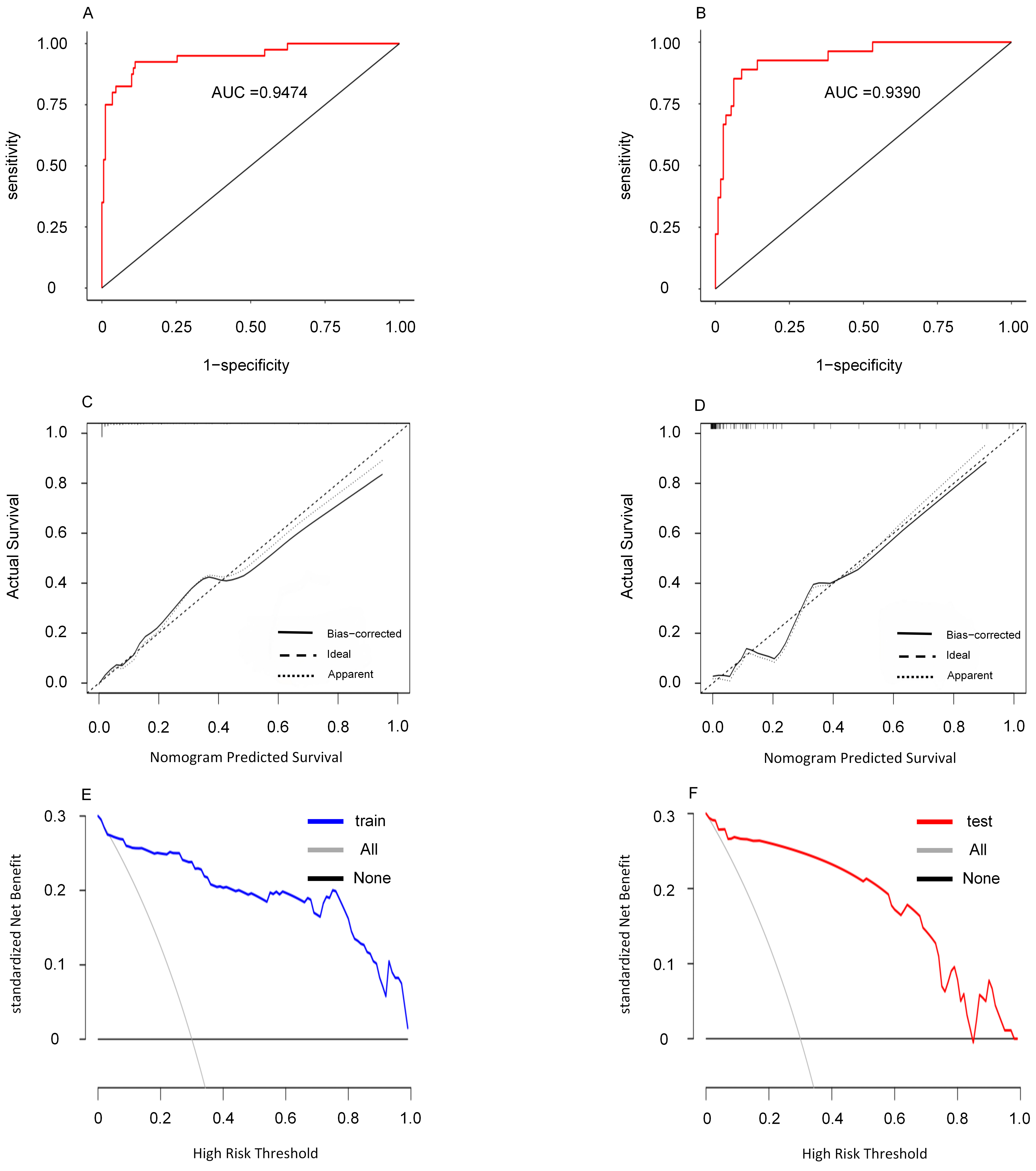 The predictive performance of the model was validated with ROC curves, achieving an area under the receiver operating characteristic curve (AUC) of 0.9474 (95% CI: 0.9044–0.9903) for the training set and 0.9390 (95% CI: 0.8880–0.9893) for the validation set. Calibration curves displayed excellent agreement between observed occurrences and predictions, while DCA indicated substantial clinical utility and net benefit across a wide score range (Fig. 4).