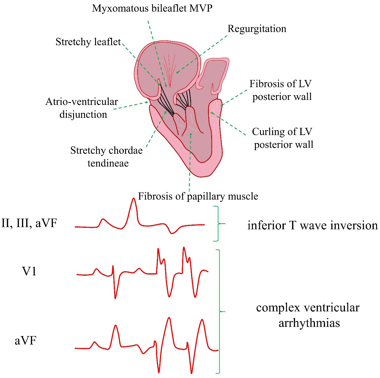 Ventricular ectopic beats (VEBs) are observed in 49–85% of cases using 24-hour Holter monitoring, suggesting that ECG abnormalities are common in patients with MVP [44]. Disease progression, MR, and structural changes, including MAD and bileaflet MVP—both of which increase the risk of VAs—all influence the occurrence of new ECG abnormalities [45, 46].