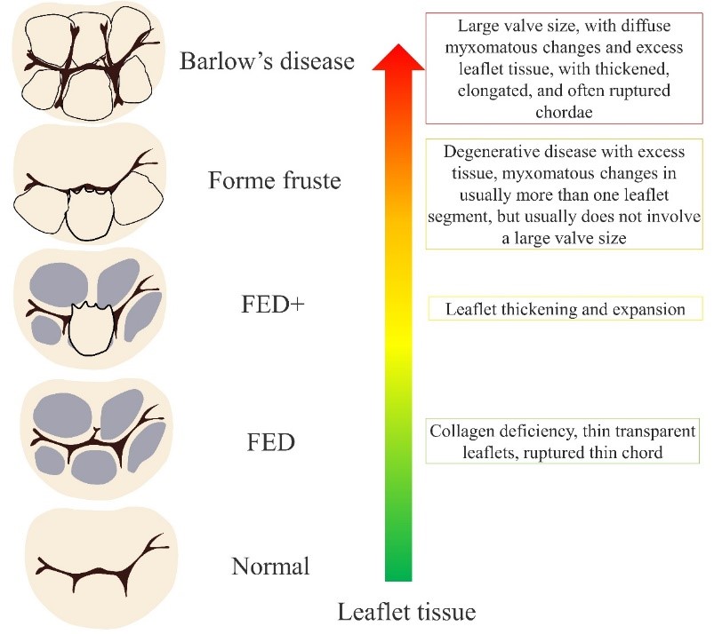 MVP degeneration encompasses a spectrum of different lesions that may involve a single segment of the valve or a multisegment condition affecting both leaflets. The pathological changes may include chordal rupture, excess tissue, myxomatous changes, tissue expansion, large annular size, etc. The pathogenesis of MVP changes is demonstrated in Fig. 2 [28, 29].