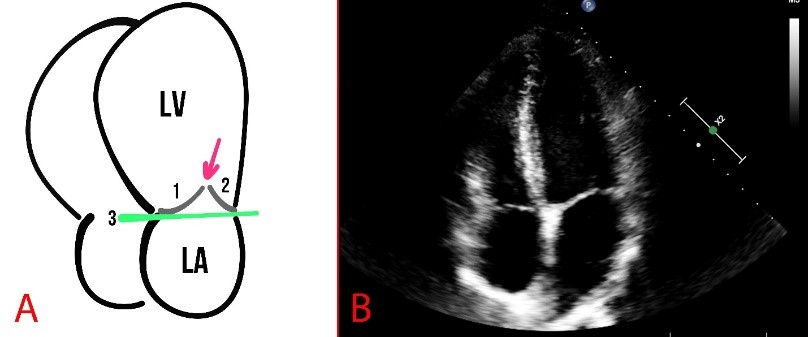 Fig. 3. Schematic presentation (A) and echocardiography (B) of normal findings. (A) The numbers 1 and 2 show the mitral valve flaps, the line (3) shows the mitral annulus, and the arrow indicates the coaptation zone. LA, left atrium.