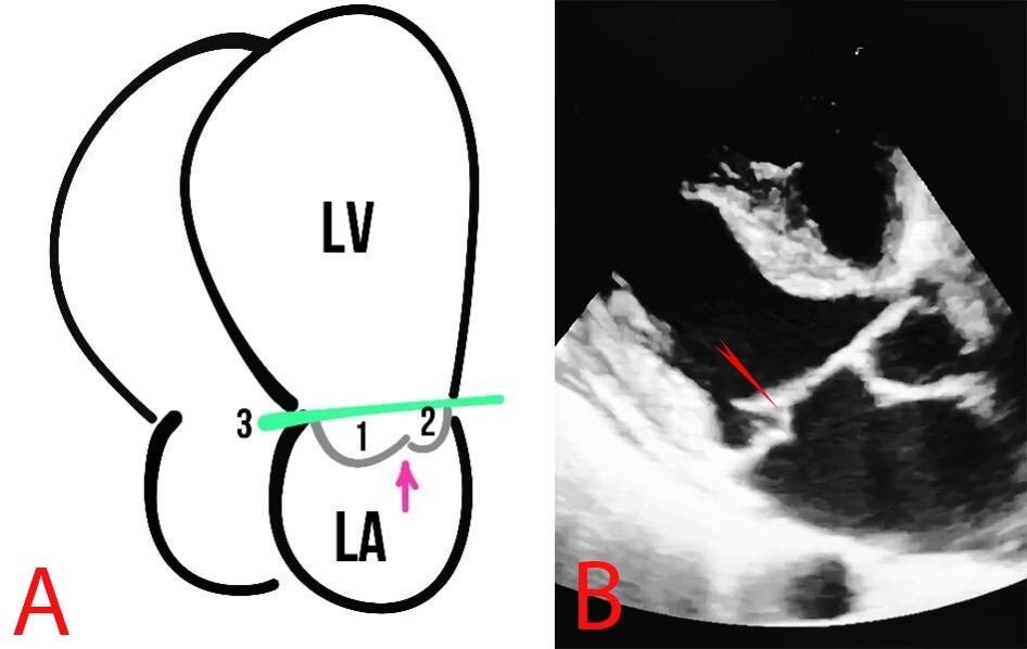 Fig. 4. MVP. (A) Schematic presentation of MVP. The arrows show the MV, 1 and 2 represent the MV leaflets, the line (3) shows the mitral annulus, and the arrow depicts the coaptation zone. (B) Echocardiography of a patient with MVP, the red arrow indicates MVP.