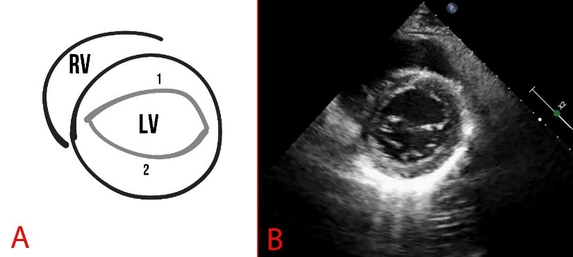 Fig. 5. Schematic representation (A) and echocardiography (B) of parasternal short-axis view at the level of the mitral valve. A fibrous annulus of the mitral valve is marked, 1 is the anterior leaflet, and 2 is the posterior leaflet of the mitral valve. RV, right ventricle.
