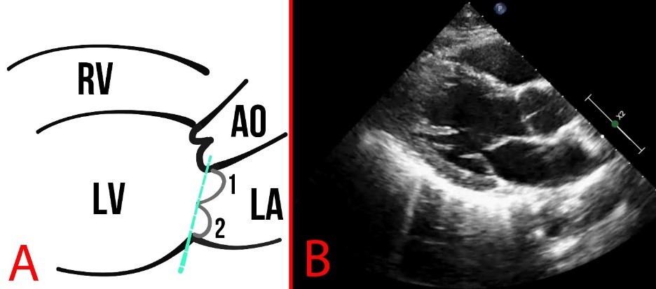 Fig. 5. Schematic representation (A) and echocardiography (B) of parasternal short-axis view at the level of the mitral valve. A fibrous annulus of the mitral valve is marked, 1 is the anterior leaflet, and 2 is the posterior leaflet of the mitral valve. RV, right ventricle.