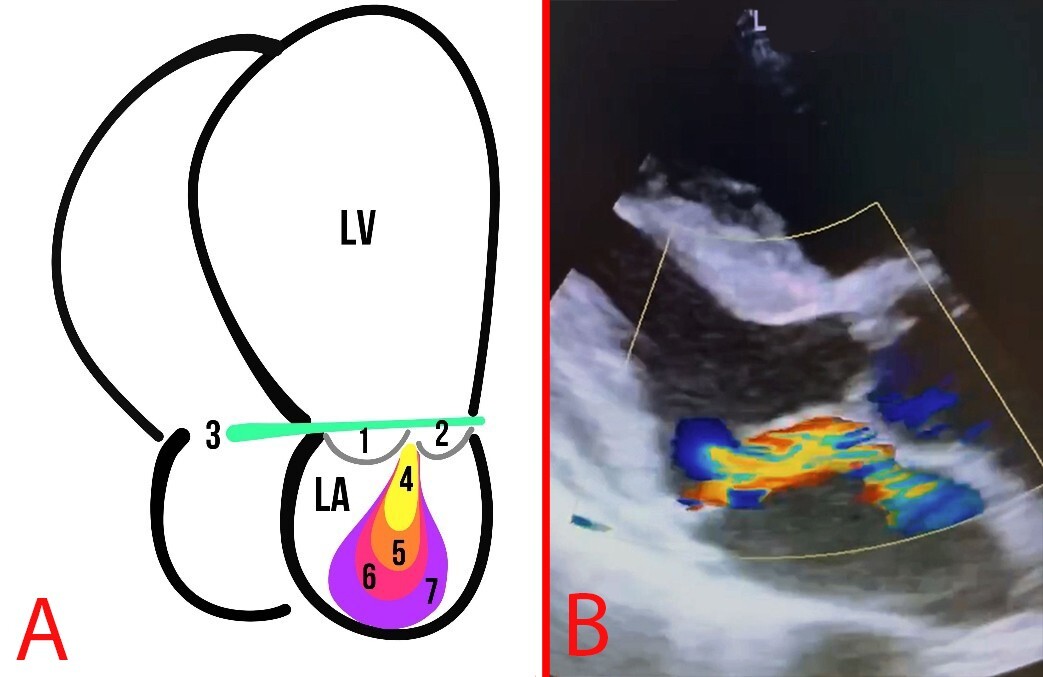 Fig. 7. MR. (A) Schematic representation of MR grades: The numbers 1 and 2 indicate the MVP leaflets; 3 depicts the mitral annulus line; 4, first degree of MR; 5, second degree of MR; 6, third degree of MR; 7, fourth degree of MR. (B) Echocardiography of a patient with MVP and MR.